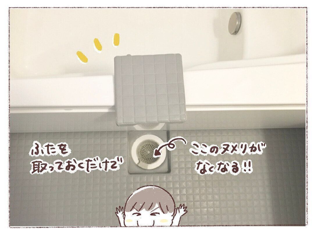 排水口の蓋は最後に外します。まだ小さい子どもがいるので、入浴時に外すと排水口に足を突っ込んでしまうことがありました。でも蓋を閉めたままだと中が乾燥せずヌメリが出てきてしまうので、使用後に必ず外すようにしています。