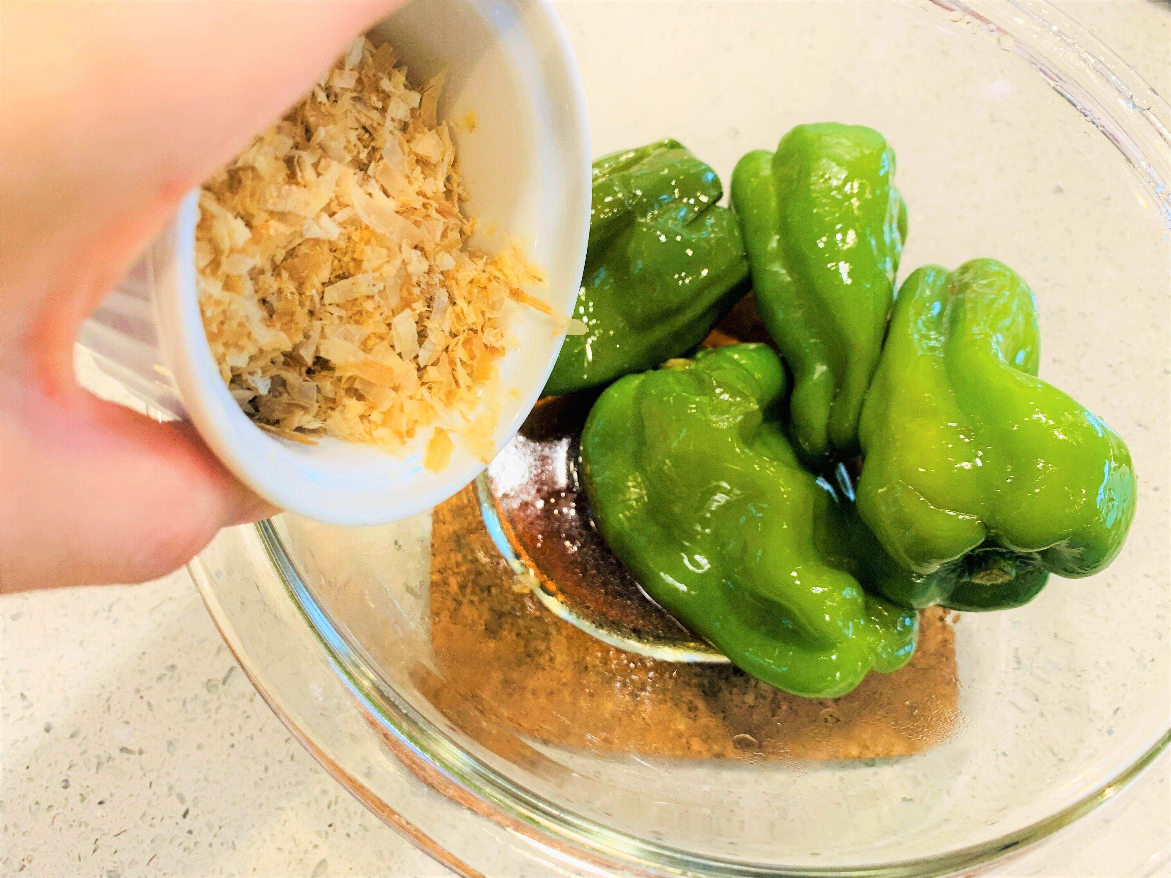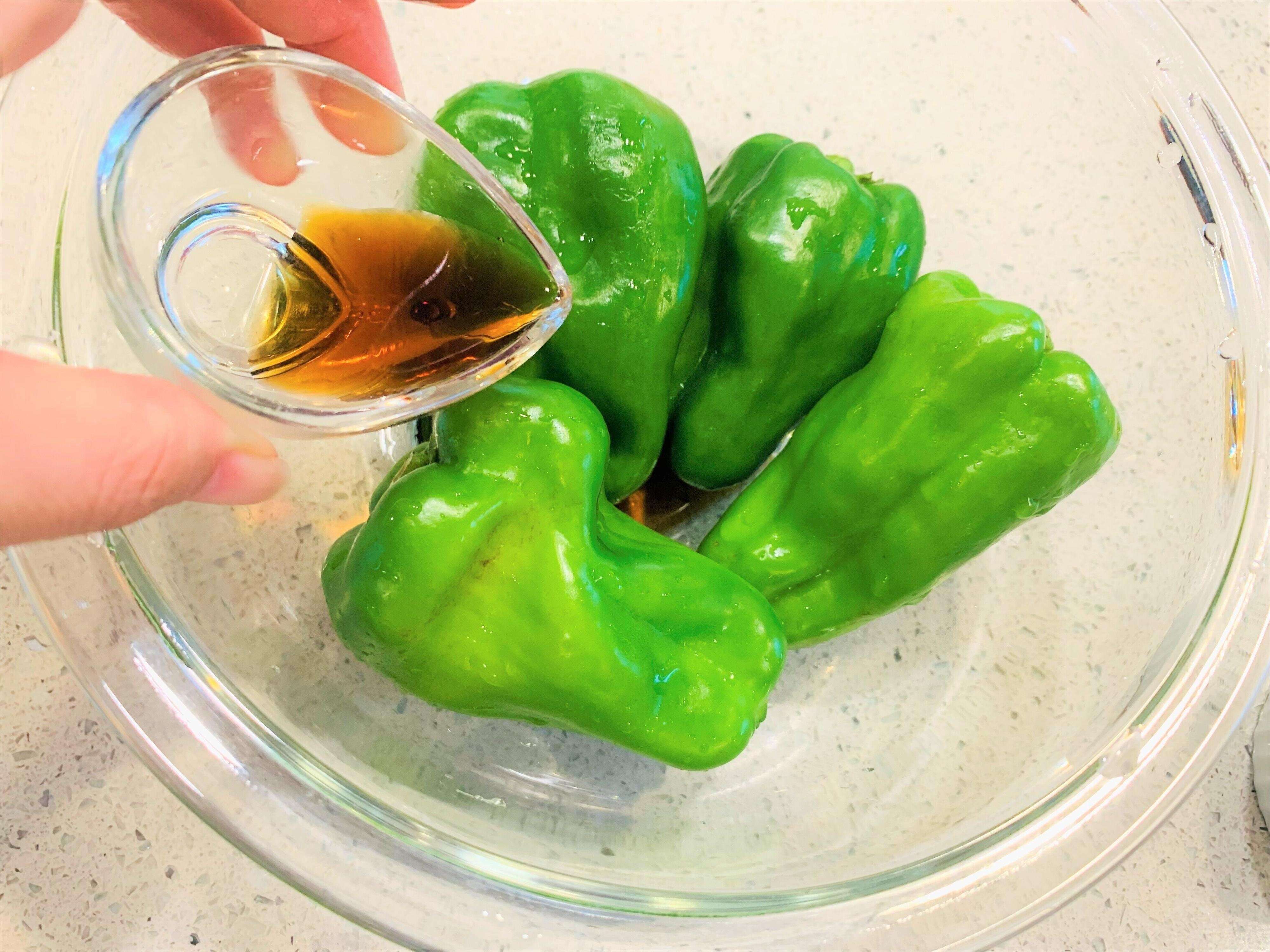 耐熱ボウルにピーマンを入れ、めんつゆとごま油を加えます。