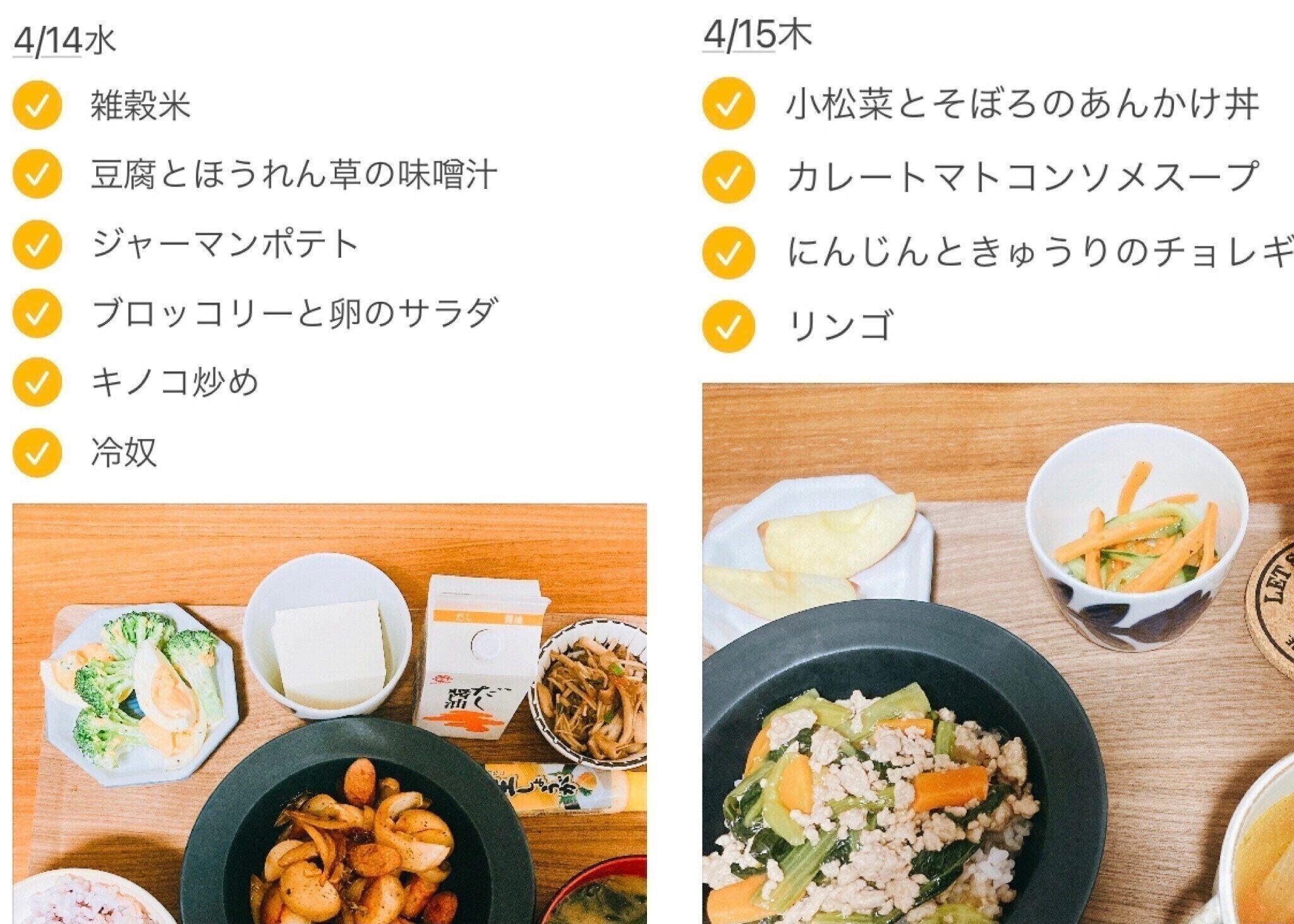 スマートフォンのメモ機能を利用し、日付と何をつくるかを箇条書きにしていきます。そして、夕食ができたら写真を撮っていっしょに保存。
