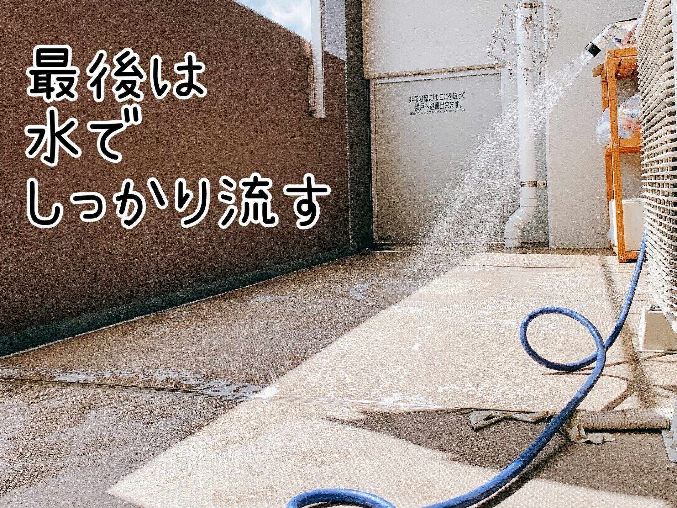 作ったオキシ液をバルコニーに少しずつ流していきます。一気に流すとご近所さんに迷惑がかかることもありますので、気を付けてください。