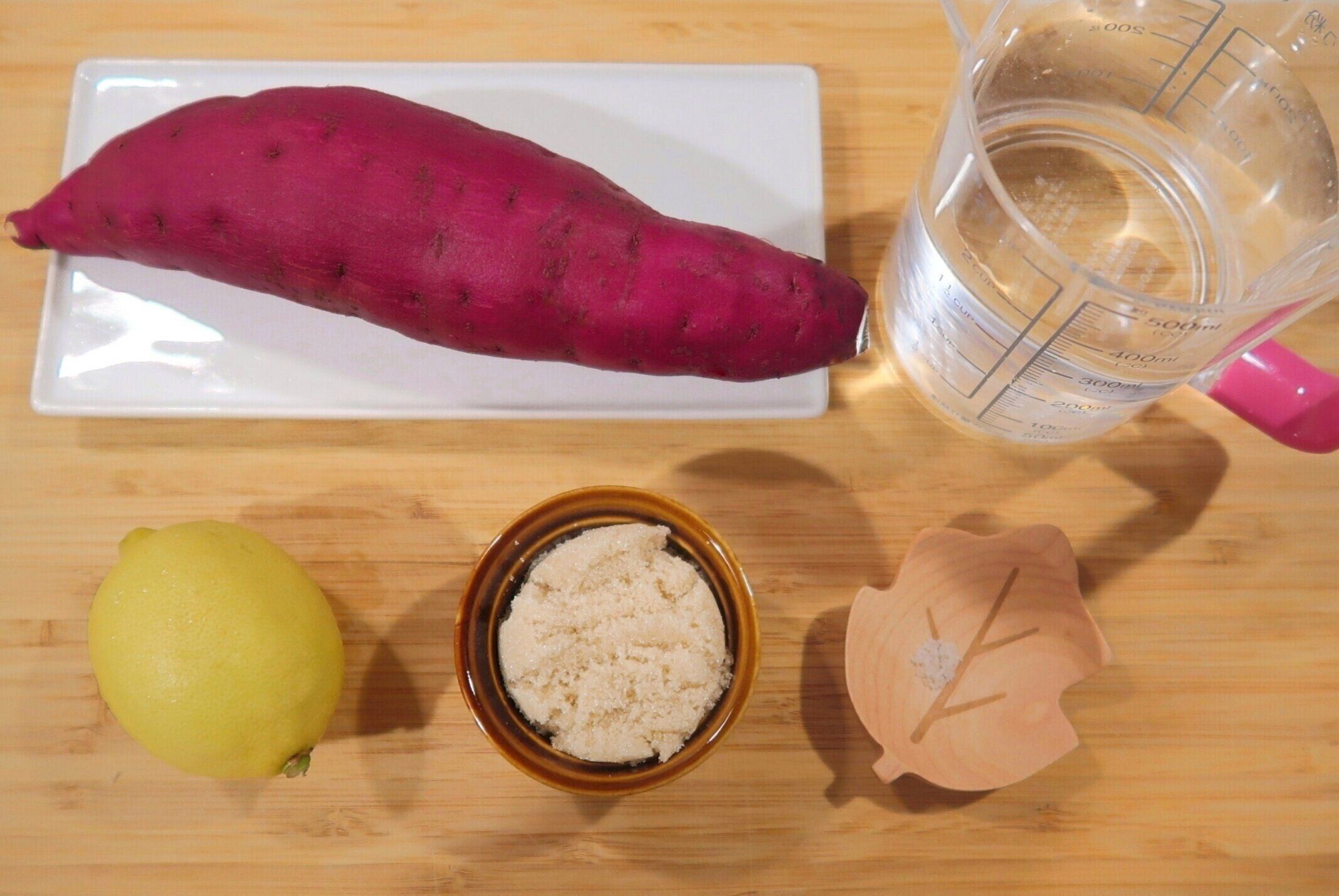 底が広めの鍋にさつまいもを重ならないように並べ、分量の水と砂糖(またははちみつ)を加えます。水面からさつまいもが顔をだす場合は、さつまいもがかぶる高さまで水を加えます。