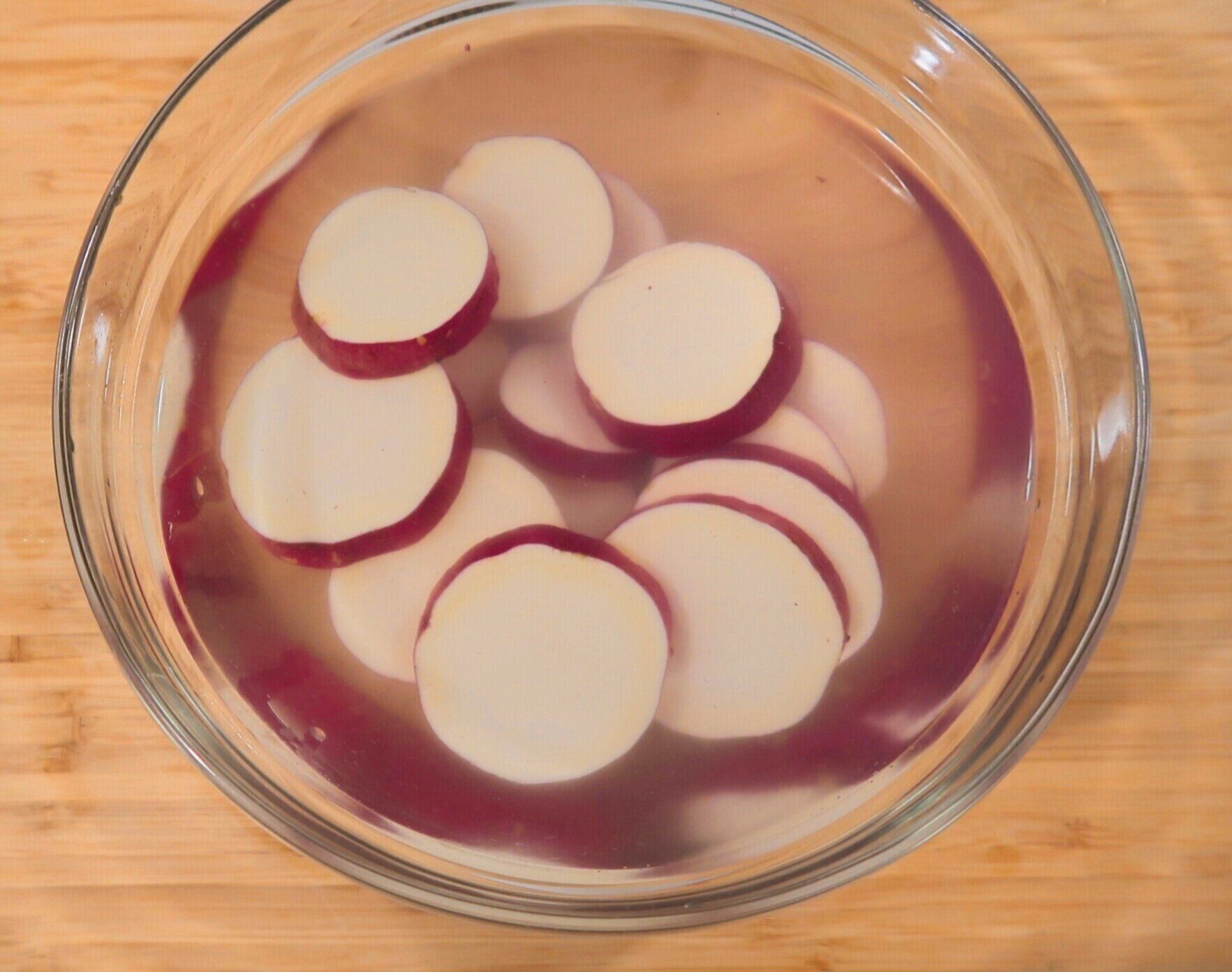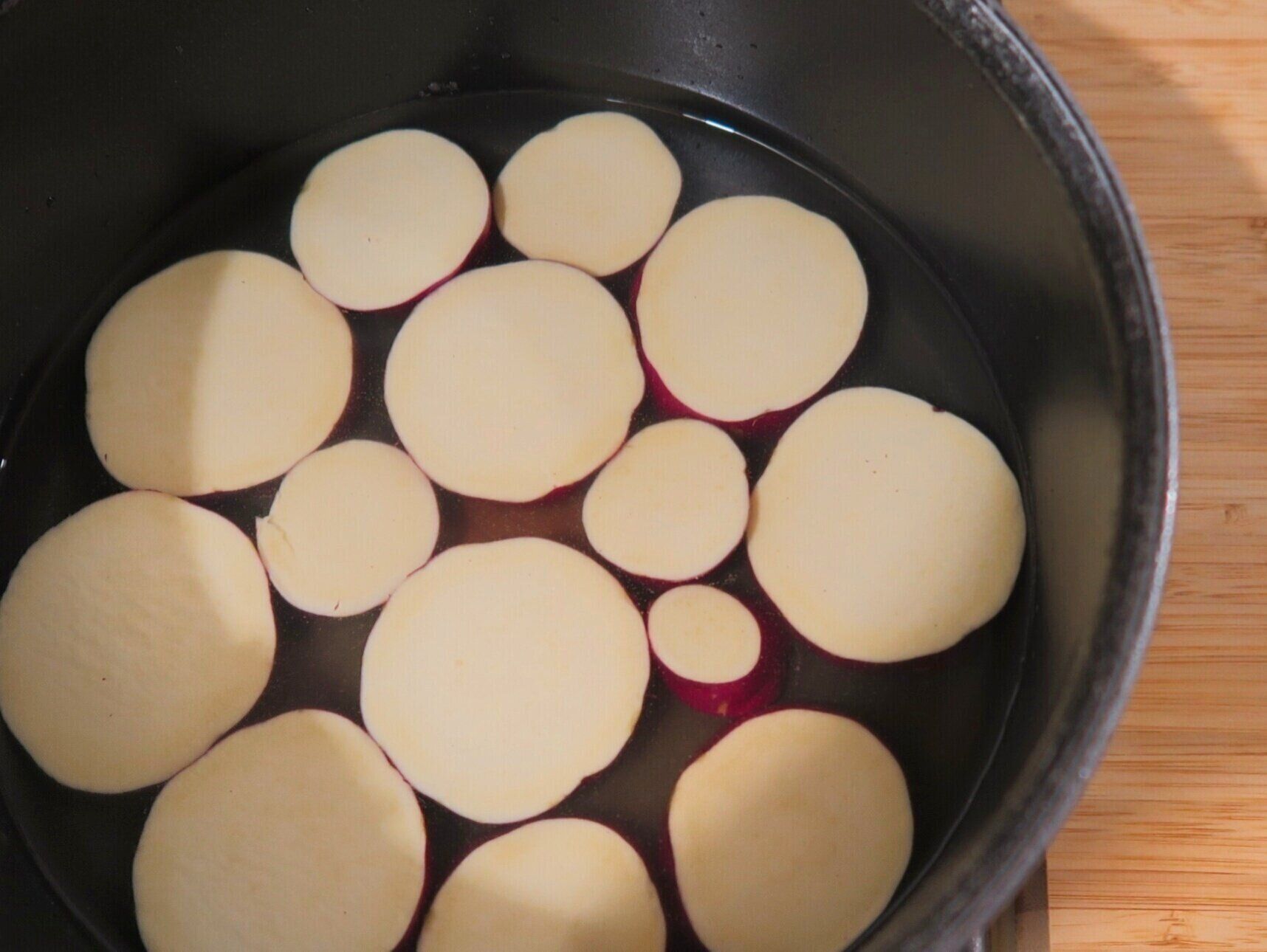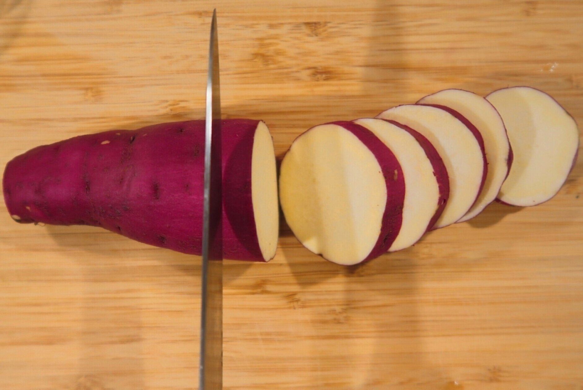 さつまいもはよく洗い、両端を切り落として1cm幅の輪切りにします。