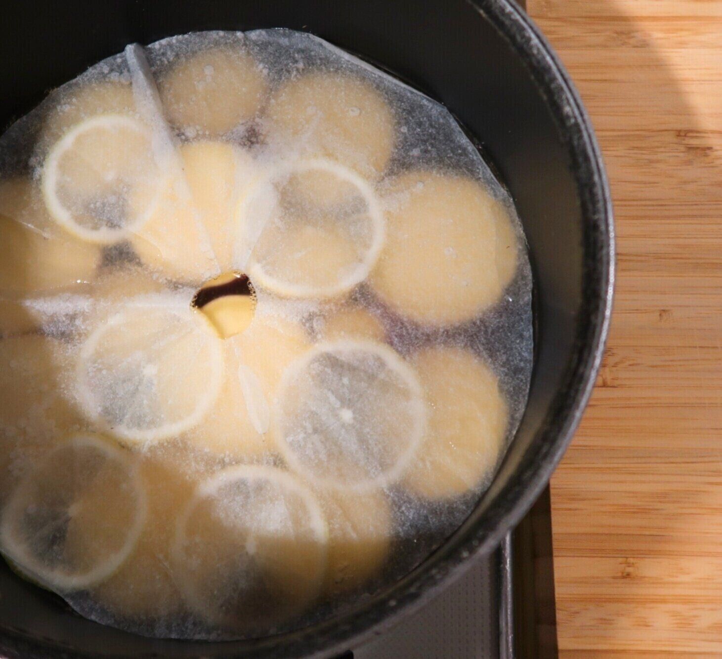 中火にかけ煮立ったらレモンの輪切りと果汁を加えて弱火にし、落としぶたをして約20分煮ます。弱火でじっくり煮ることでさつまいもの甘さを引き出します!
