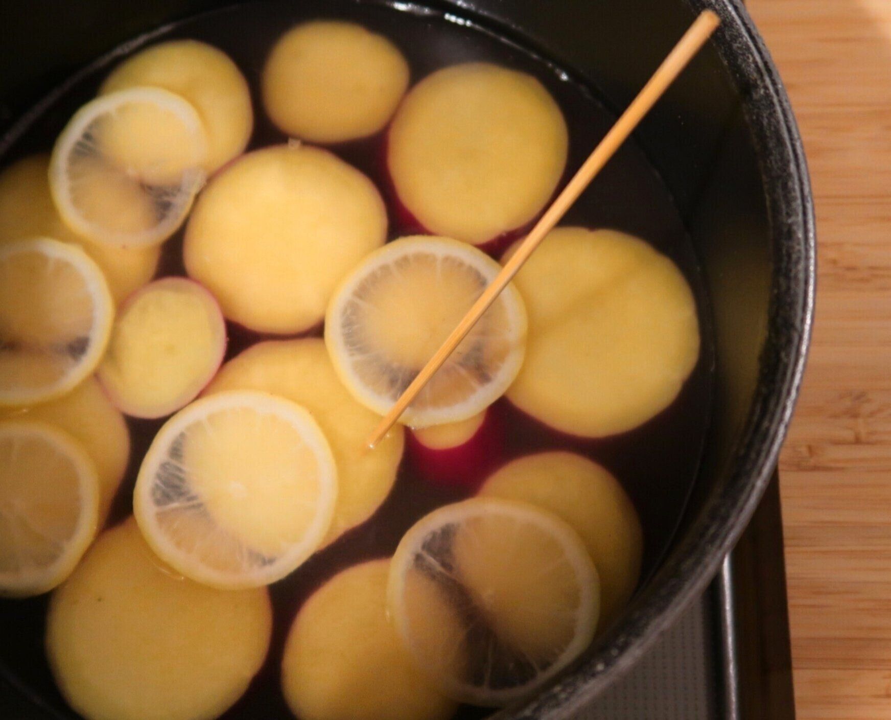 竹串がすっと通るくらいのやわらかさになったら、そのまま冷まして味を染み込ませます。