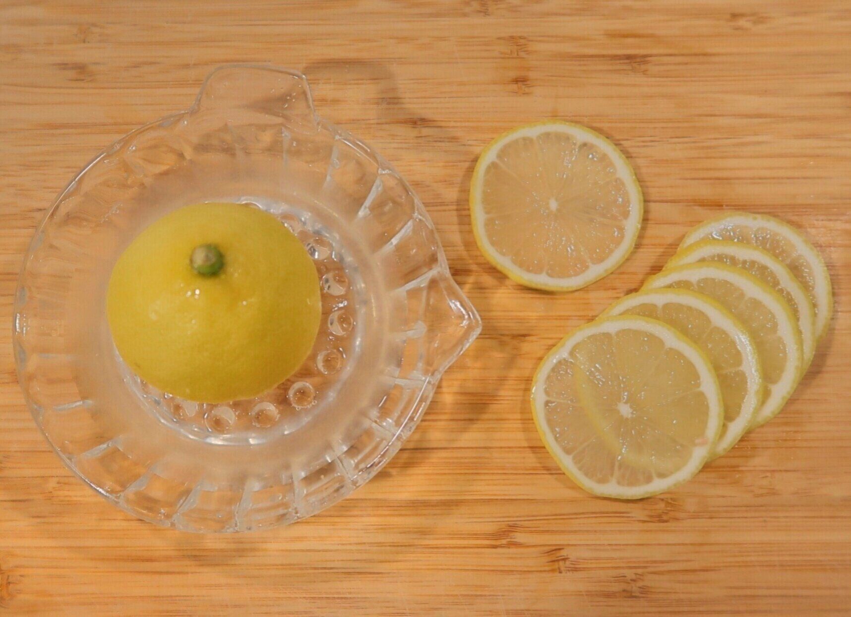 レモンはよく洗い、半分をうすい輪切りにし残りは果汁をしぼります。種は竹串などで取りのぞきます。