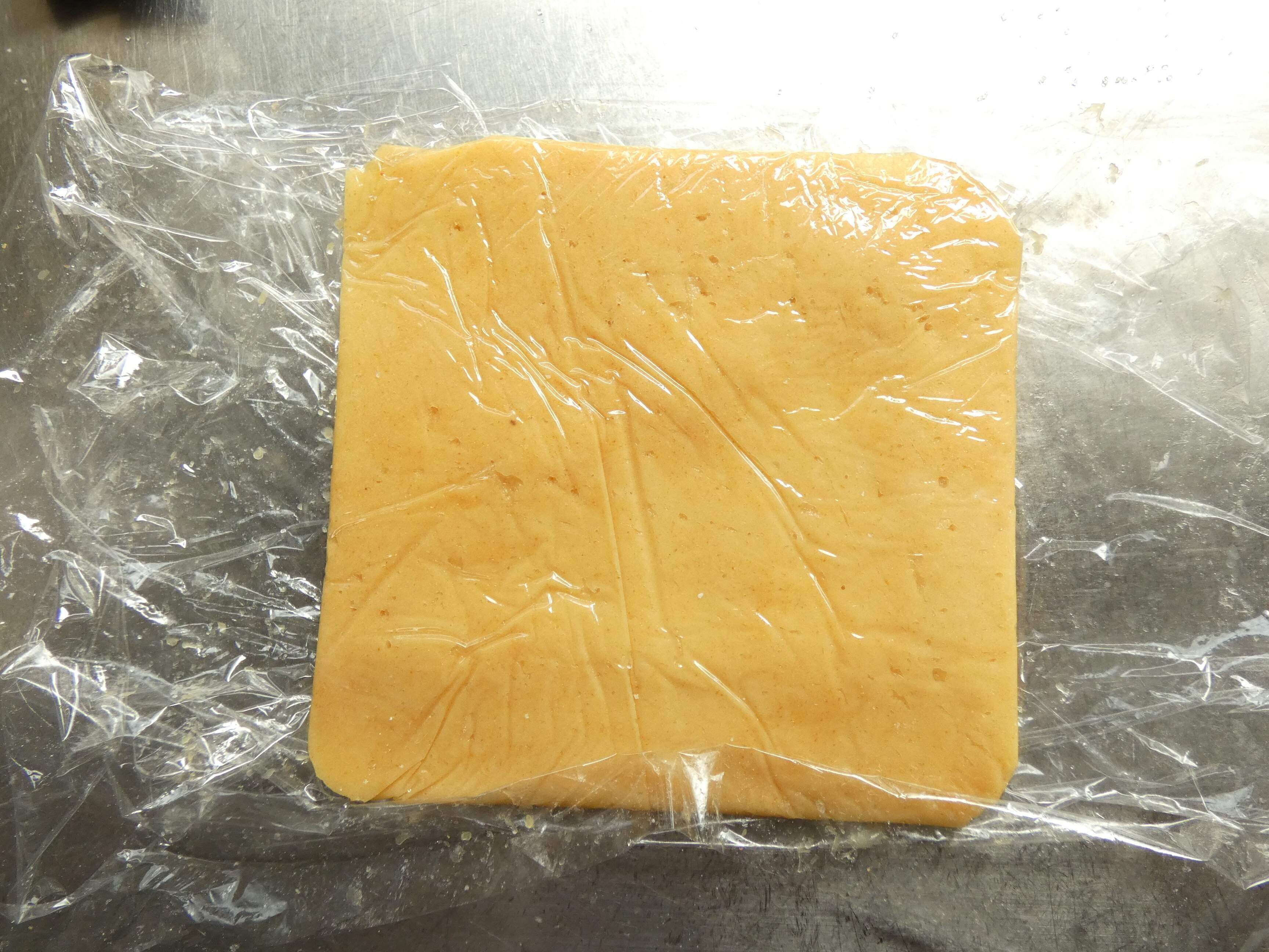 4.生地を2等分し、ラップに挟んで食パンの大きさに合わせてのばします。