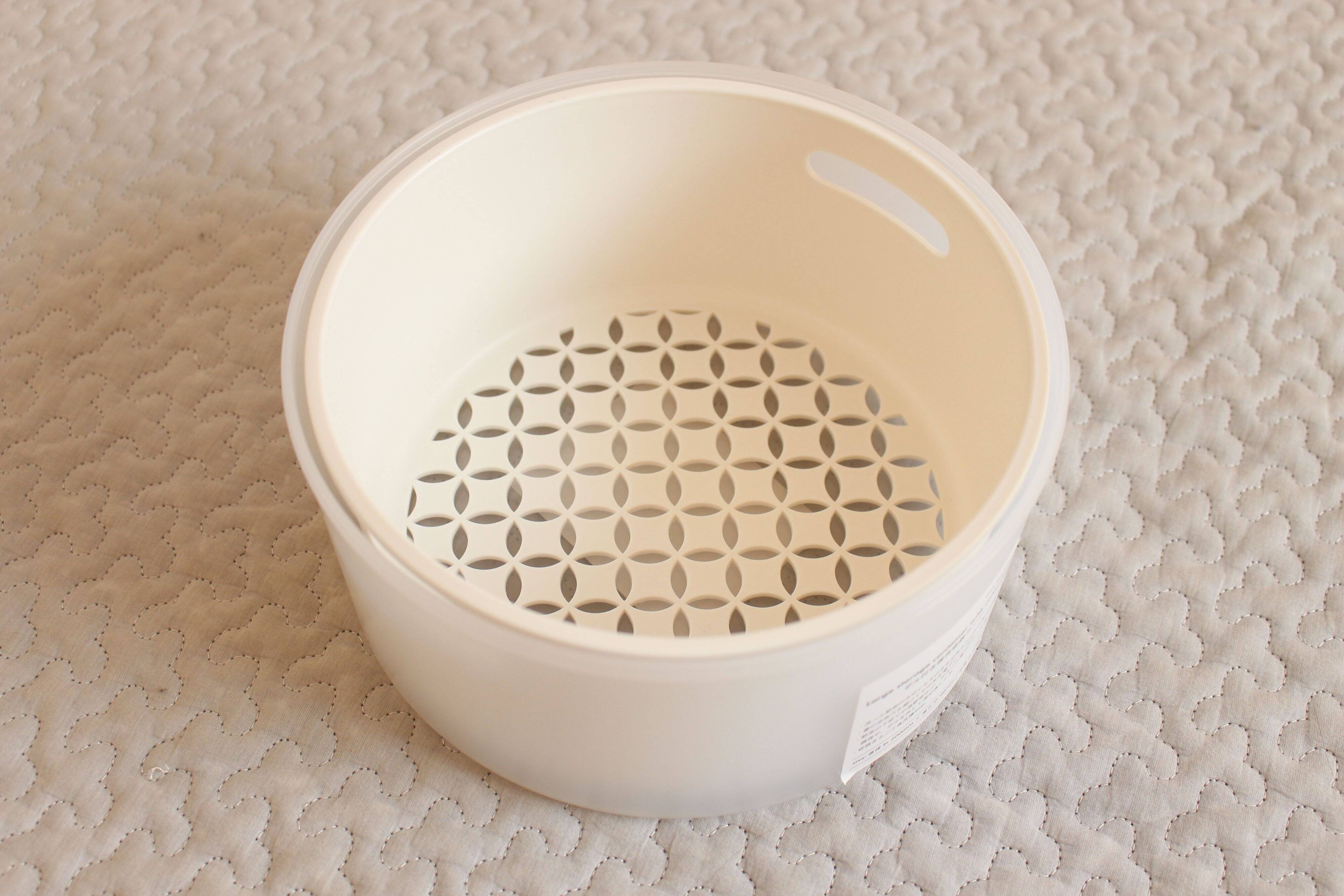 この保存容器、実は水切りができちゃうんです!見た目もシンプルでデザインも素敵。水切りできる底の部分もお花のような形で可愛いですよね。