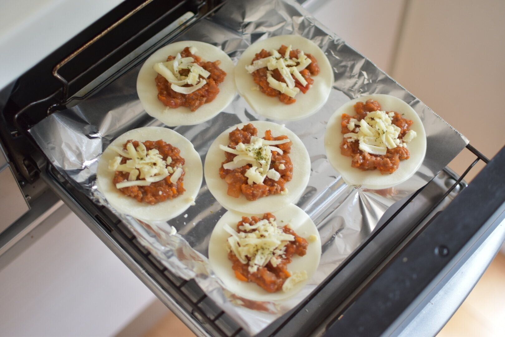 ピザトースト以外にも餃子の皮でピザ風にしても。アルミホイルを敷いたら準備完了です。餃子の皮にお好みの具材を乗せたら、焼き目がつくまで焼いていきましょう。カリッと仕上がりますよ。