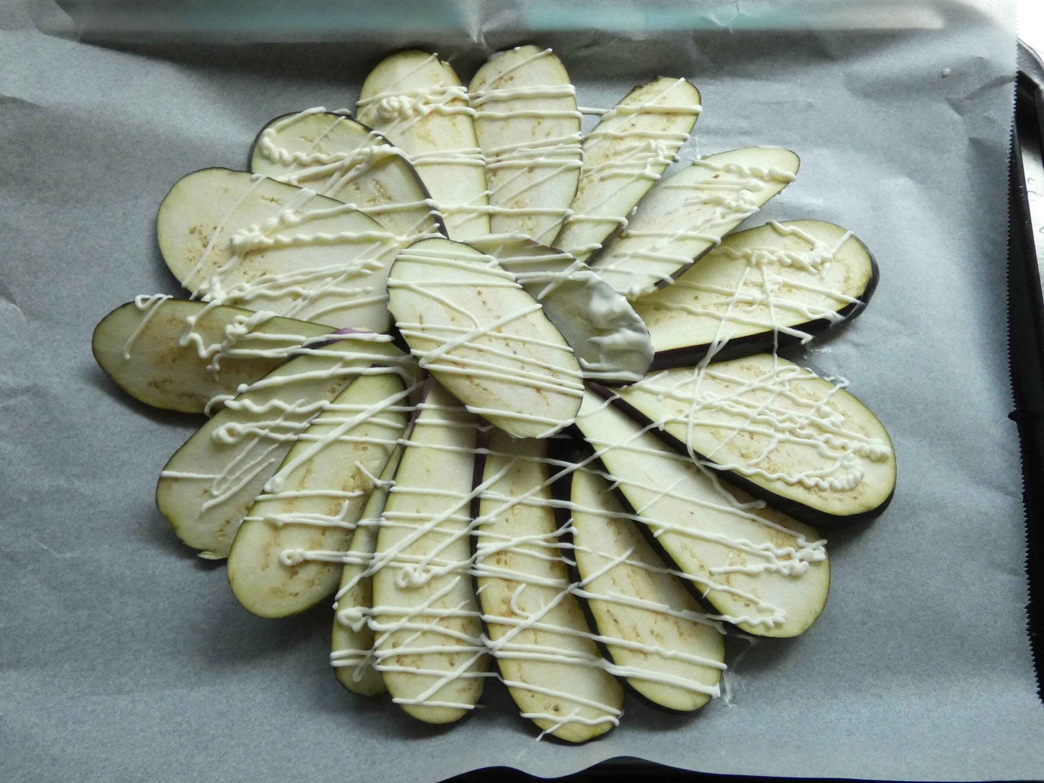 3.天板にクッキングシートを敷き、ナスを並べます。マヨネーズをラップに包んで輪ゴムでとめ、楊枝で穴を開けてナス全体にかけます。