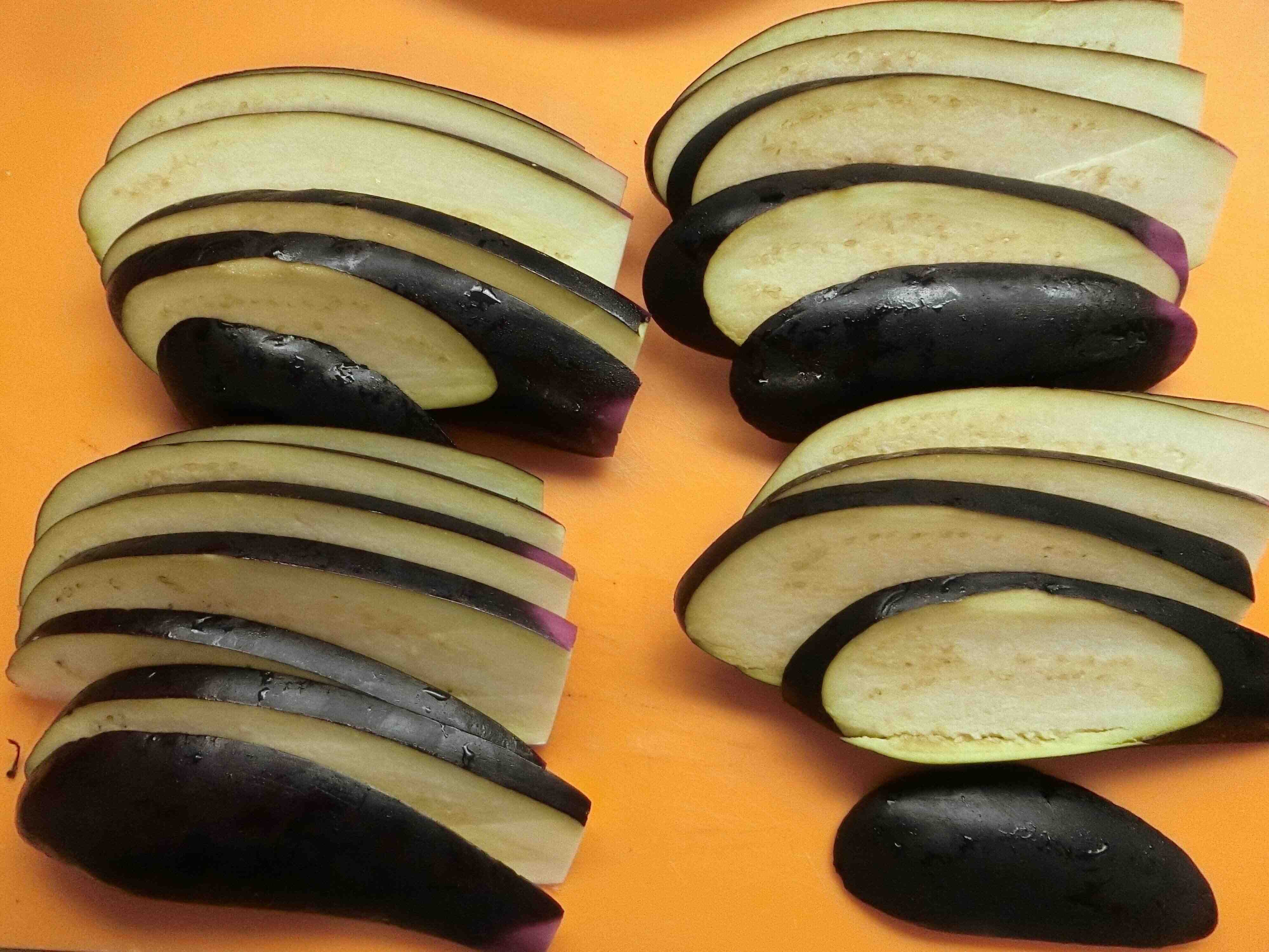 2.ナスはへたを落とし、縦1㎝幅に切ります。