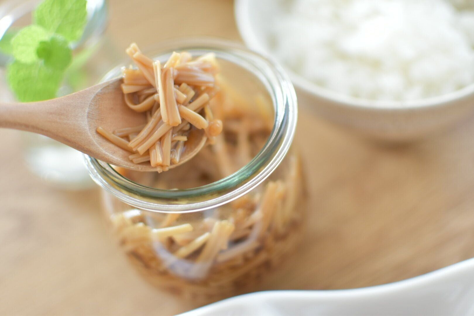 とろっとした甘辛いえのきでごはんが進みます。”ごはんのとも”といえば”なめたけ”。特別な材料は使わずにできますよ。