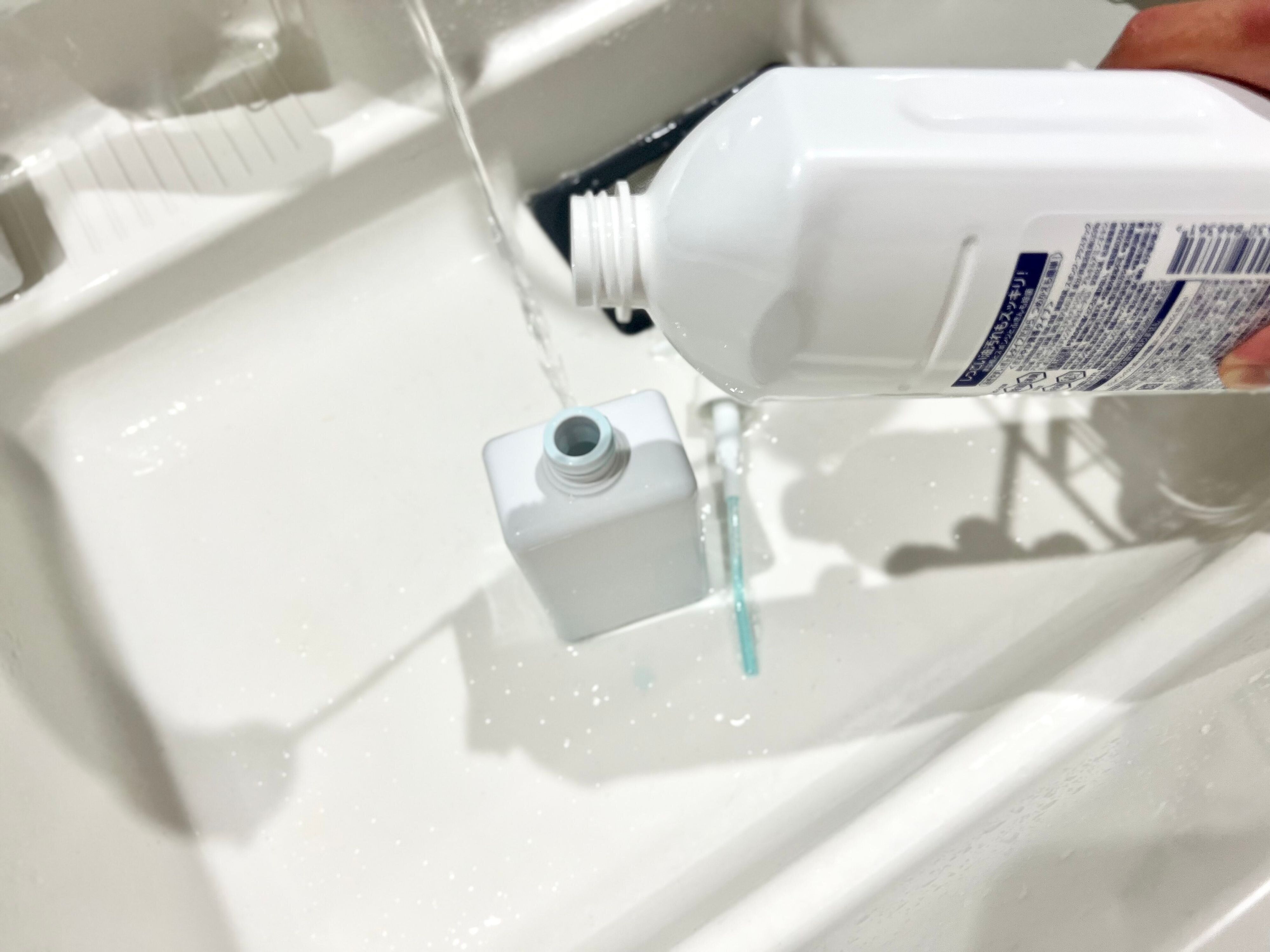 食器用洗剤に水を入れてしまうと雑菌が繁殖し、洗浄力も弱まるので汚れも落ちづらくなります。かえってお水も時間もムダに使ってしまいます。スポンジから臭いが出てしまうことも。