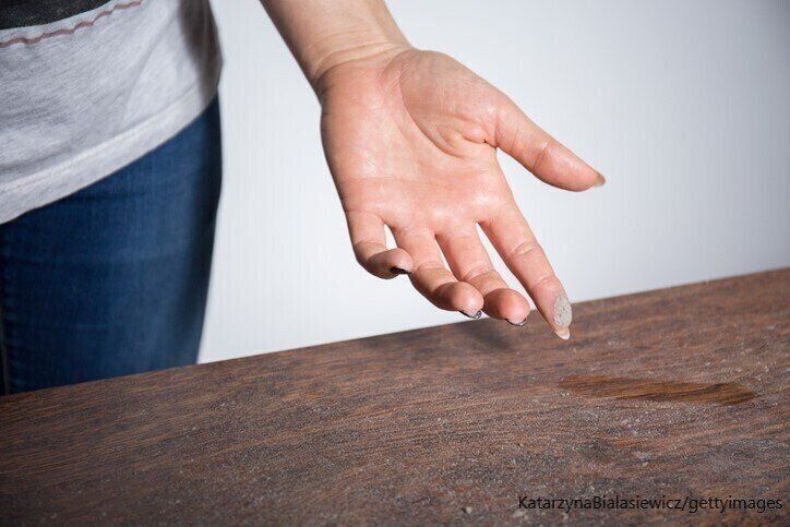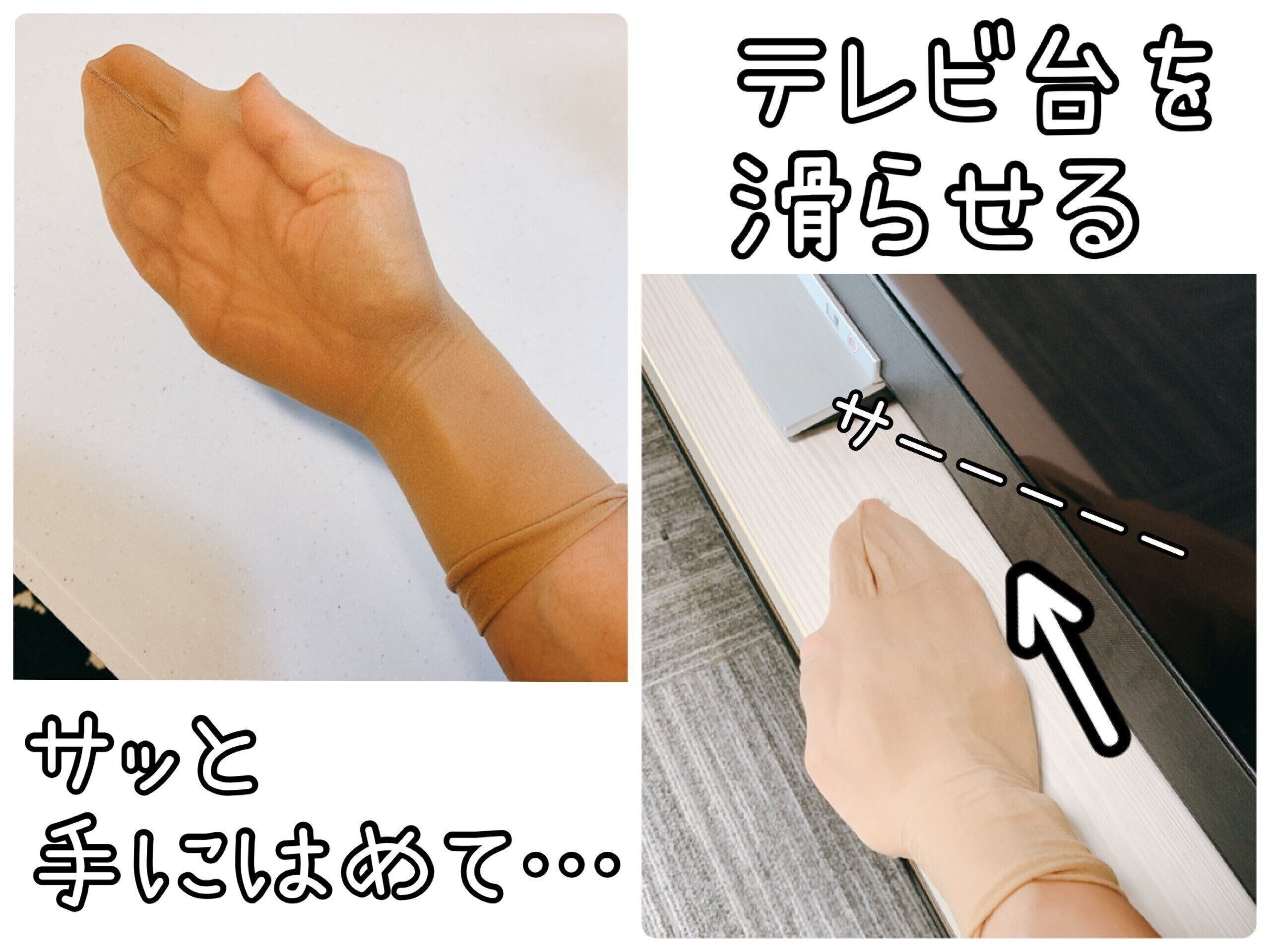 やり方はとても簡単。切ったストッキングに手をとおします。そして、テレビ台や棚の上などホコリが気になる箇所に手をあてて、スーッとすべらせるだけです。静電気でホコリが驚くほど取れていきます!