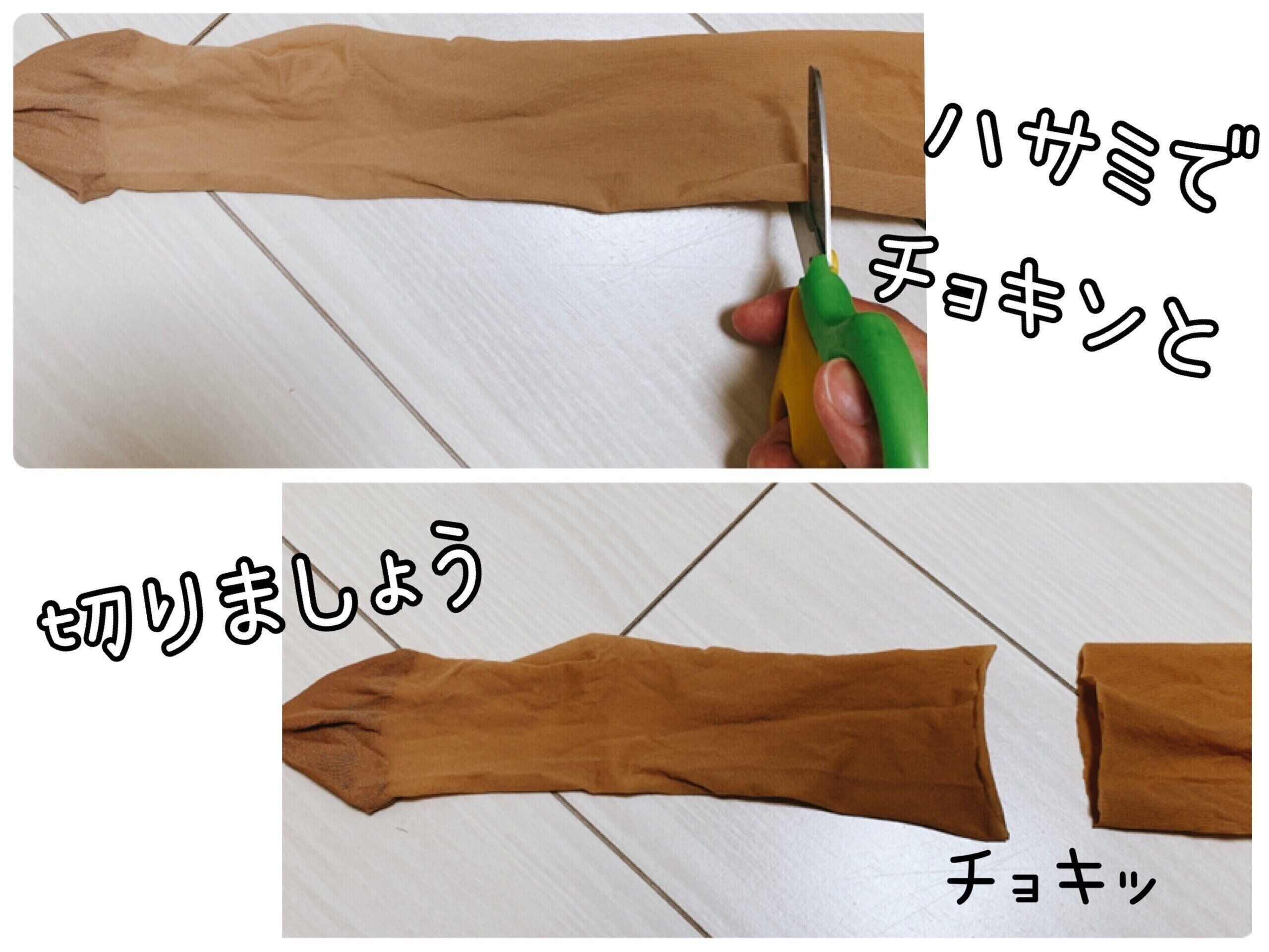 それではさっそく、つくってみましょう。ストッキングのひざあたりをハサミで切ってください。ハサミで切るだけであっという間に掃除アイテムのできあがりです。