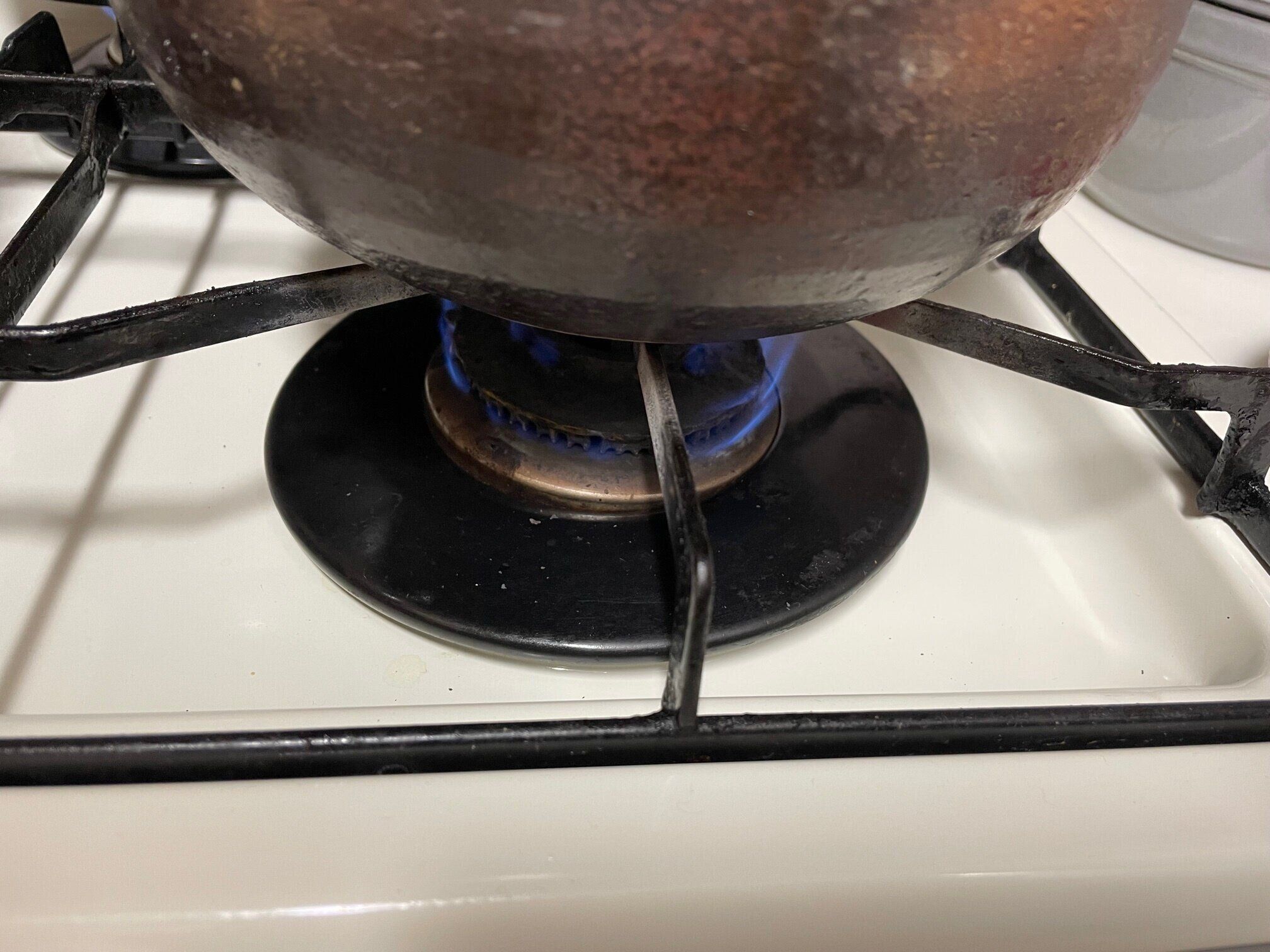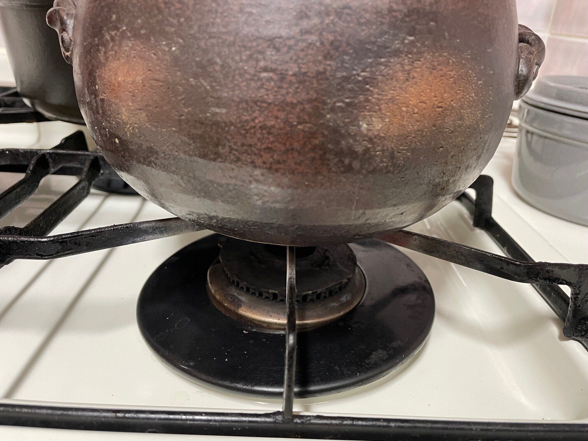浸水が終わったら火にかけます。土鍋からはみ出ない程度の中火から強火の間くらいの火にかけます。
