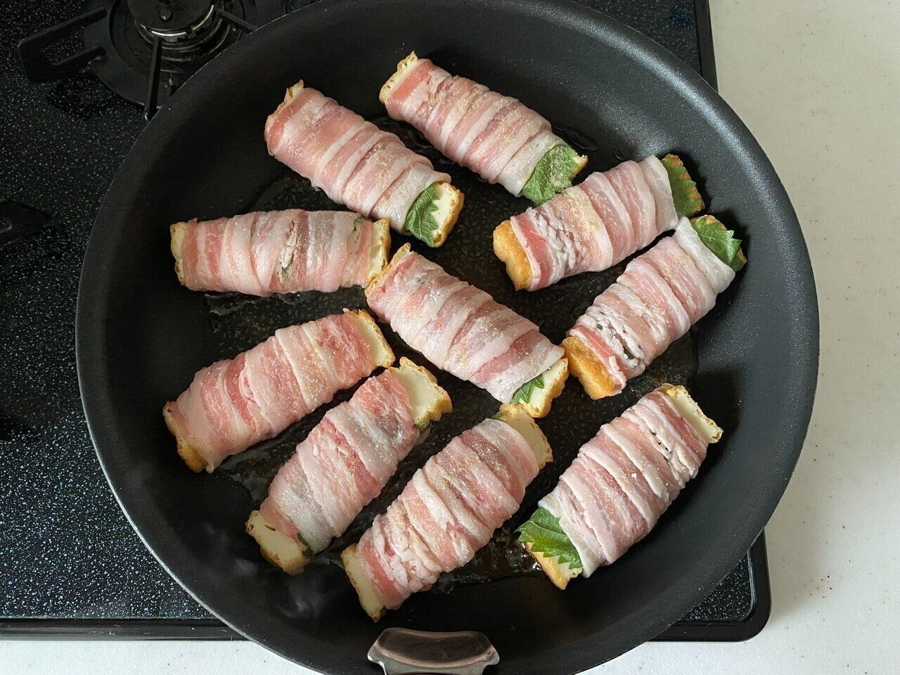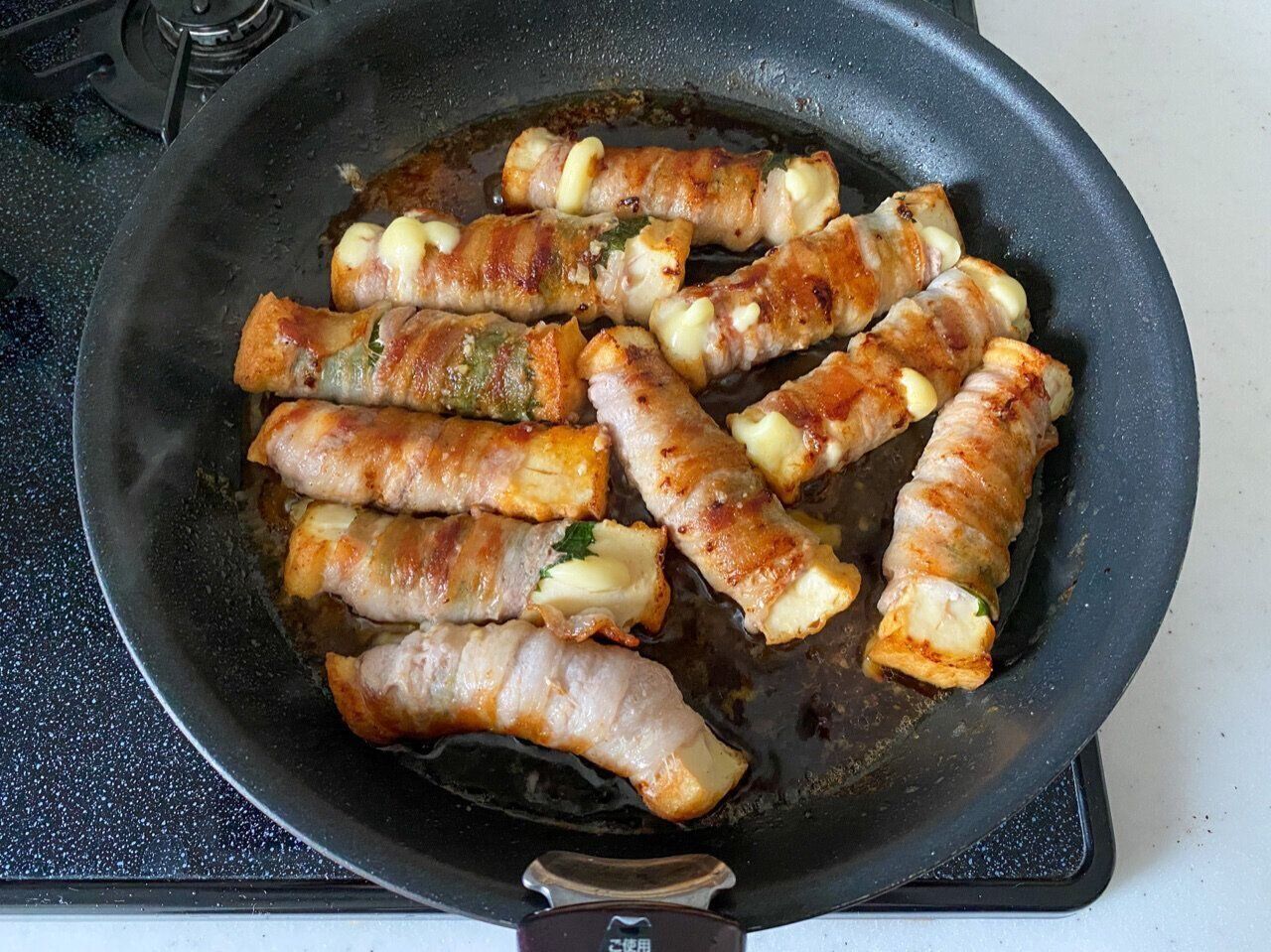 フライパンに並べる際は、肉の巻き終わりを下にすると剥がれにくいです。