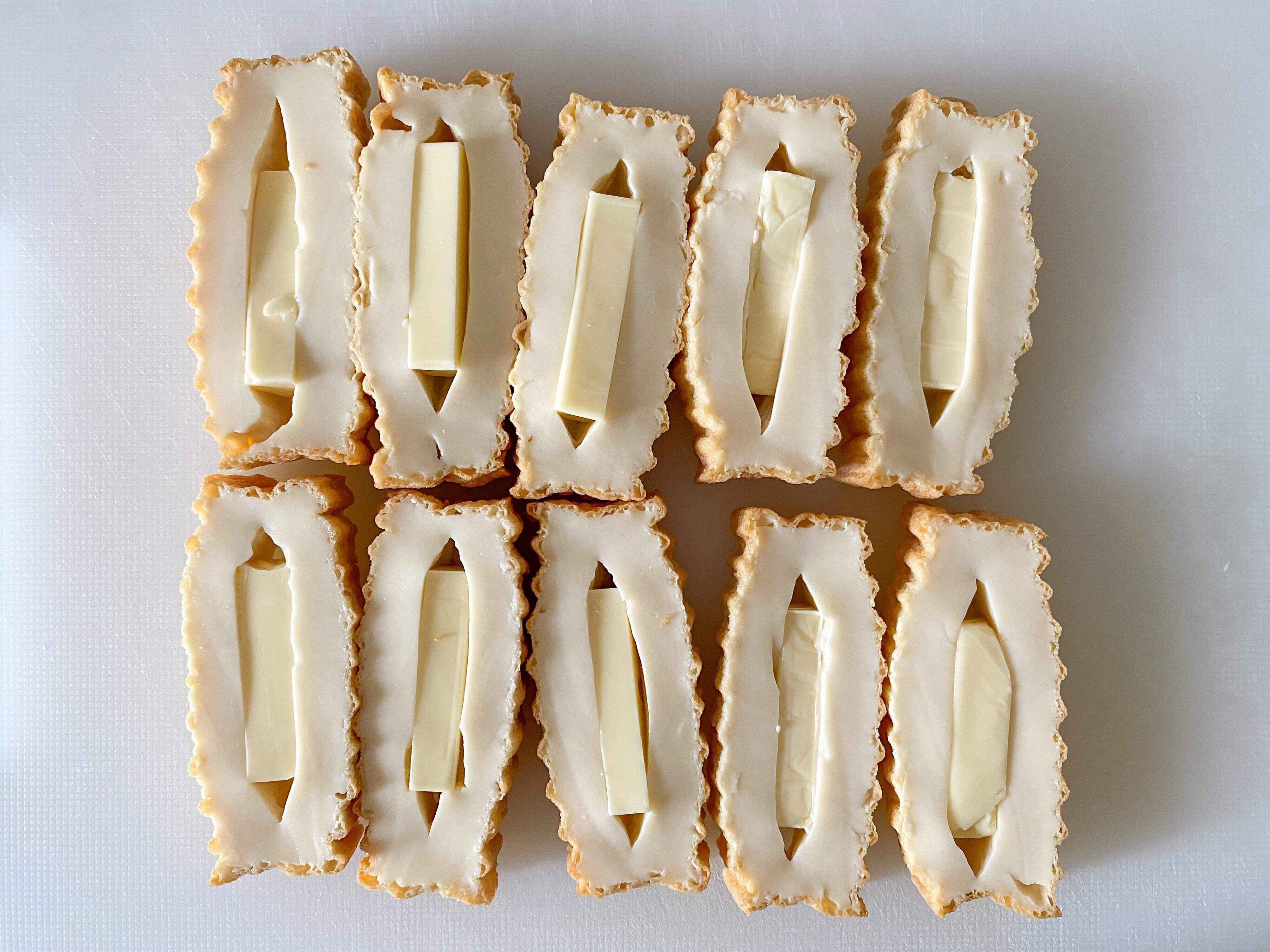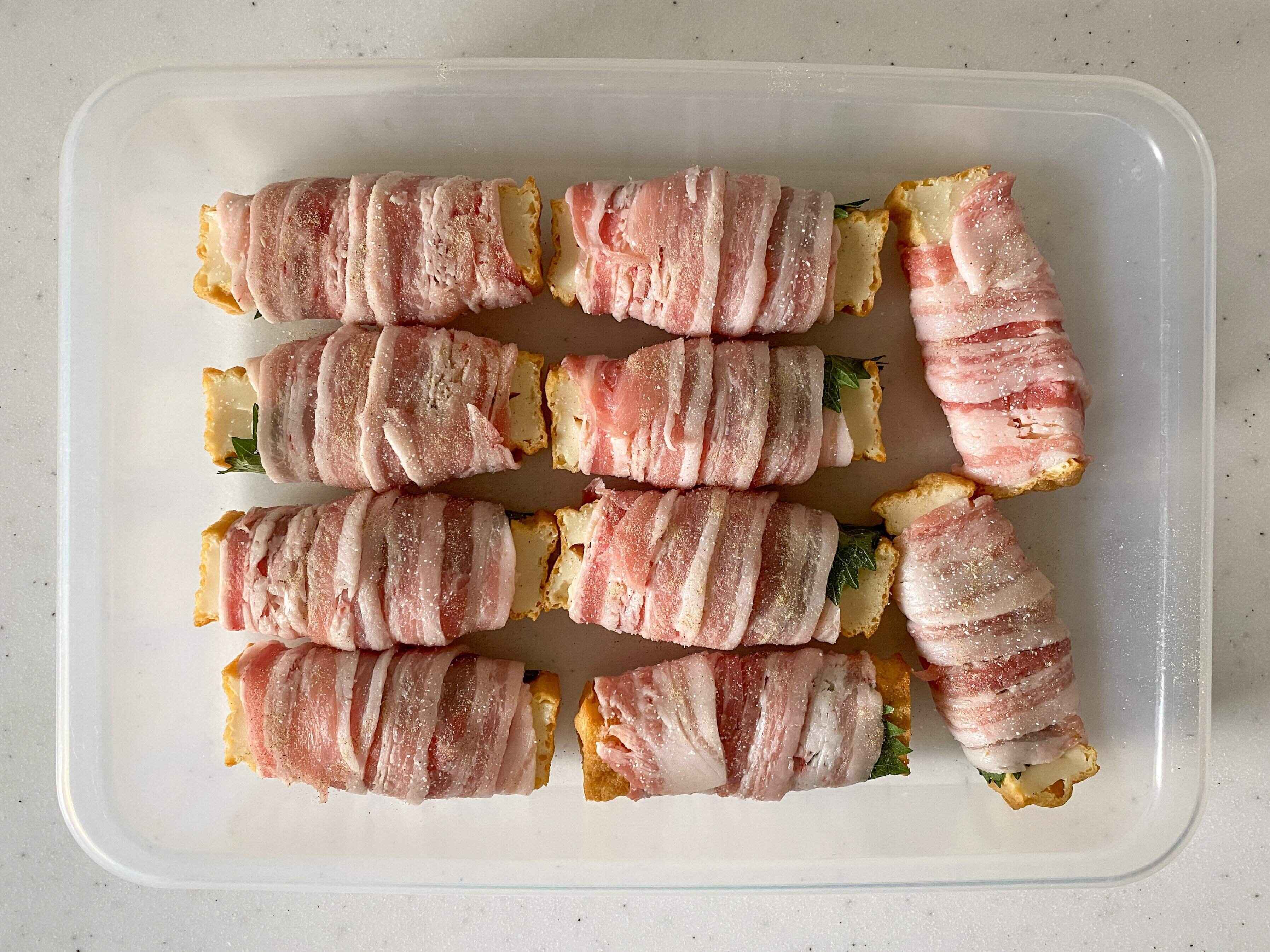 今回、厚揚げは8cm四方のものを2枚使用しています。この大きさなら、5等分で約1.5cm幅になるのでおすすめです。またチーズはQBBベビーチーズのような小分けの長方形タイプを使用すると、3等分しやすいです。