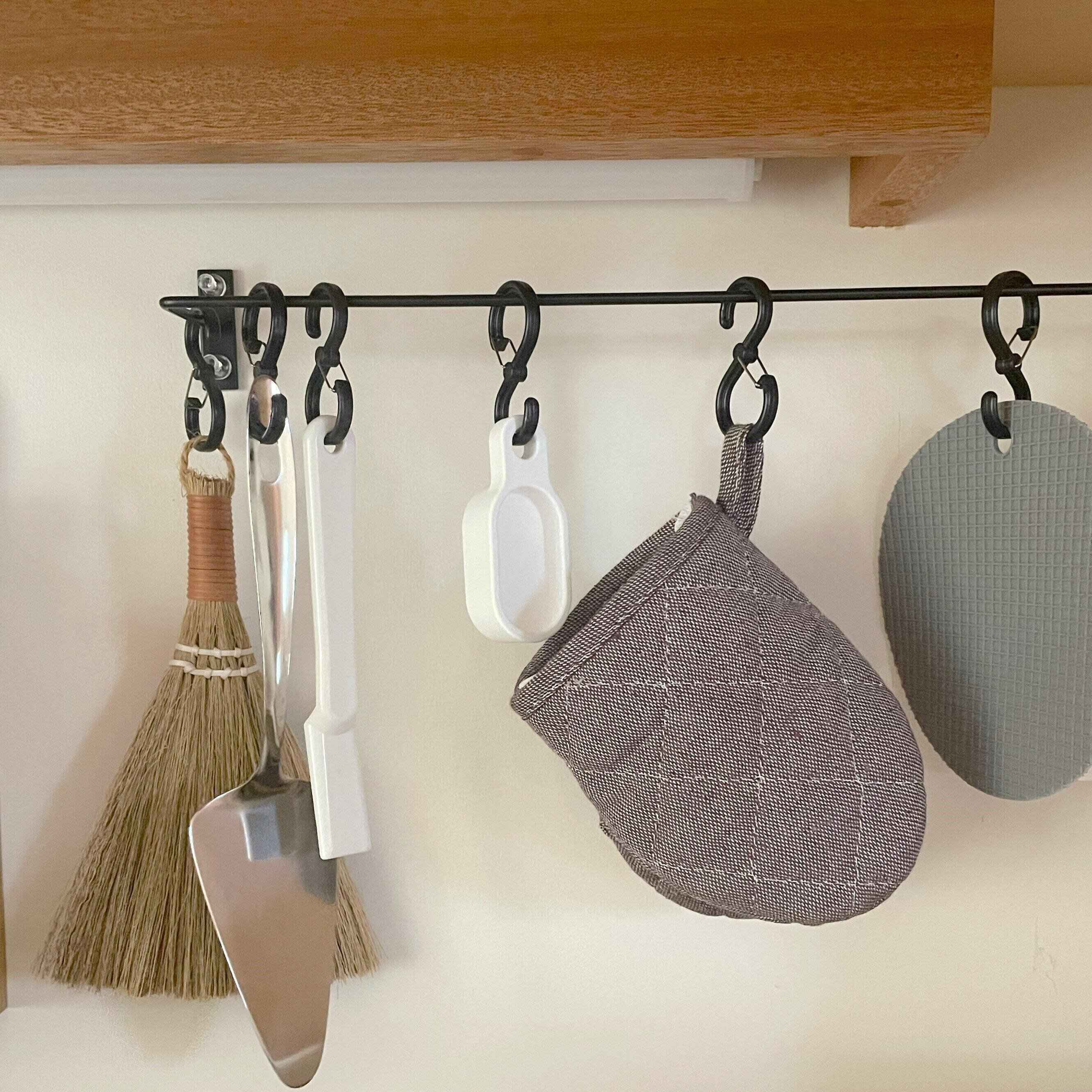 更に持ち手部分に穴が開いているので、このようにフックで吊るして収納しておくことができます。空中収納で定位置が決められて片付けも楽ですね!