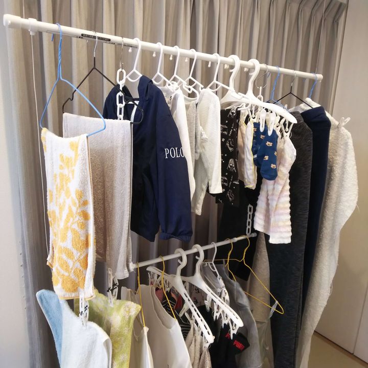 こちらの写真をご覧ください。干す際には、ハンガーどうしを「こぶしひとつ分」あけるといいといわれていますが、びっちりとハンガーがかけられています。これだと乾くのかどうか心配になりますよね。