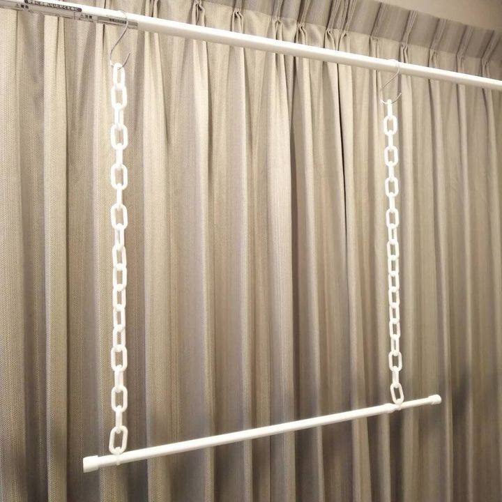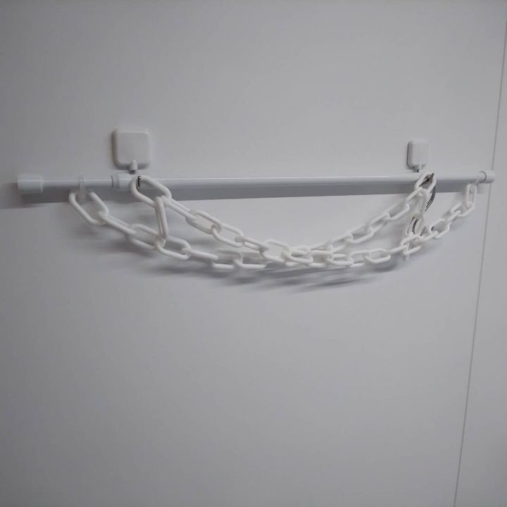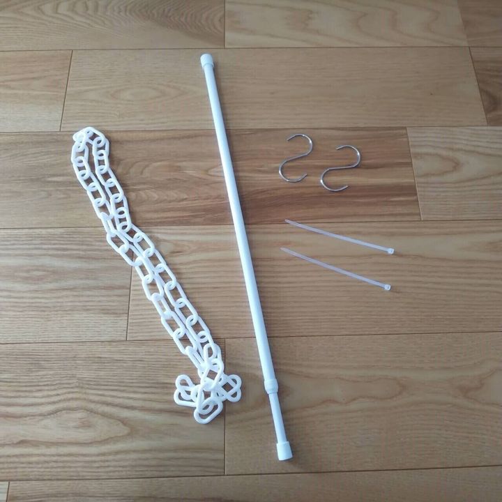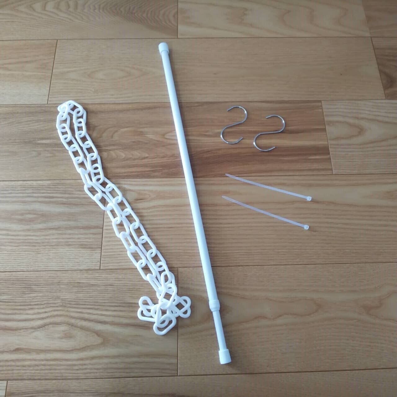 4. プラスチックチェーンとつっぱり棒を結束バンドで結ぶ。つっぱり棒の長さをあとからでも調整できるように、片方はつっぱり棒の細くなっている部分に結ぶと良いです。