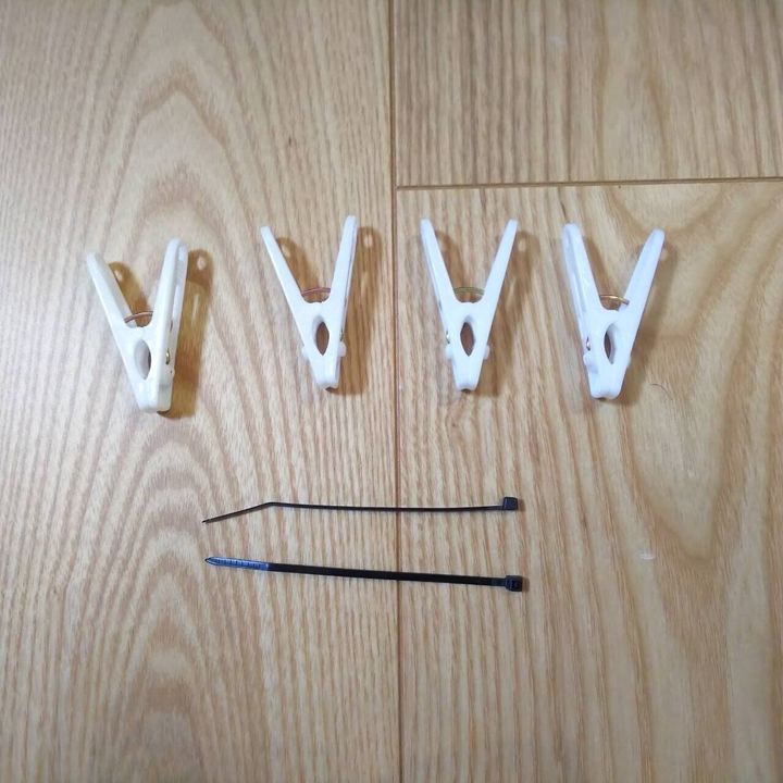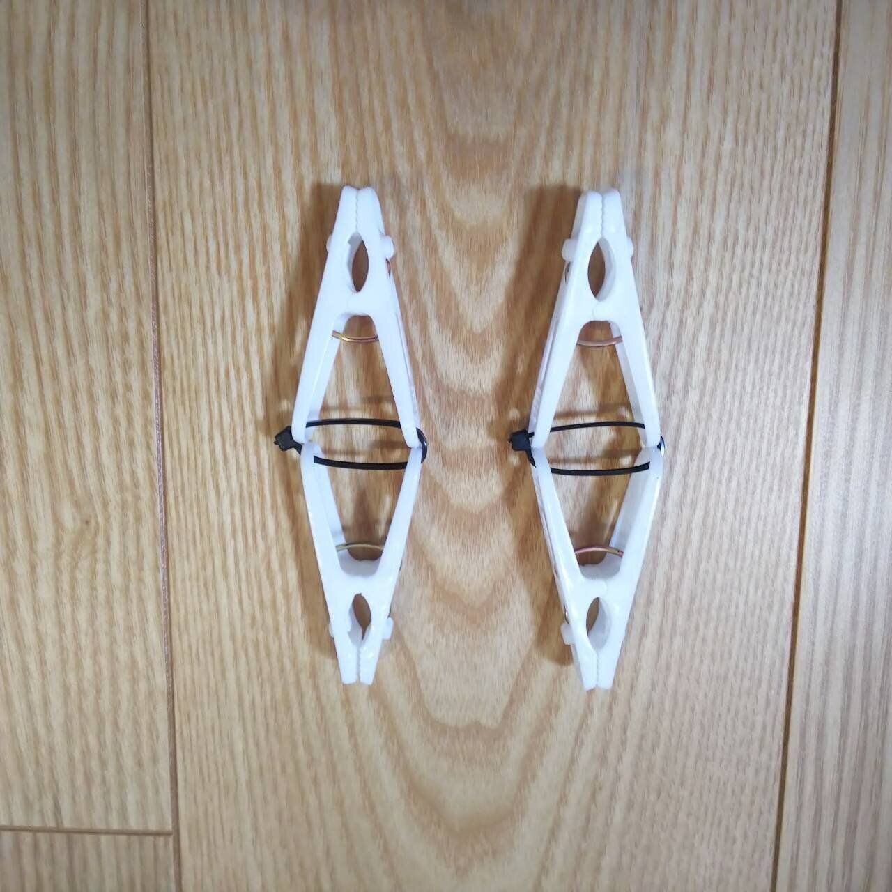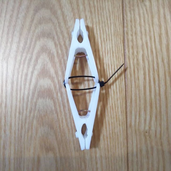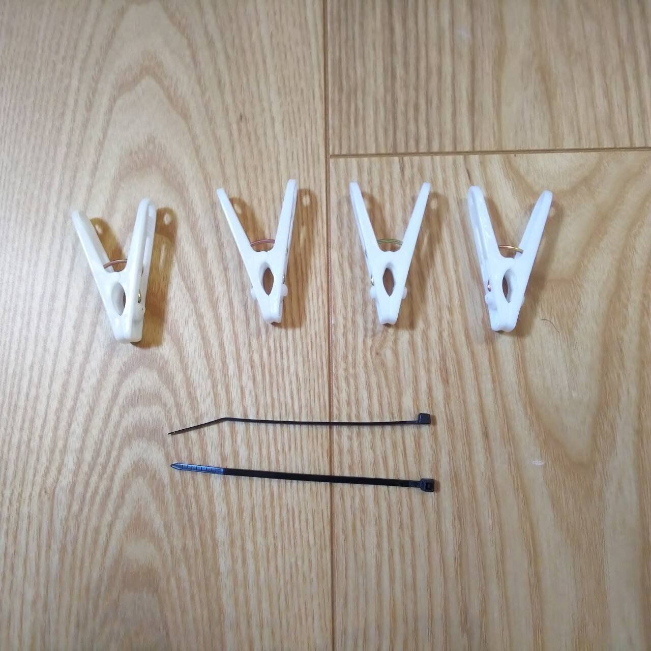 1. 結束バンドに洗濯ばさみを2つ通します。