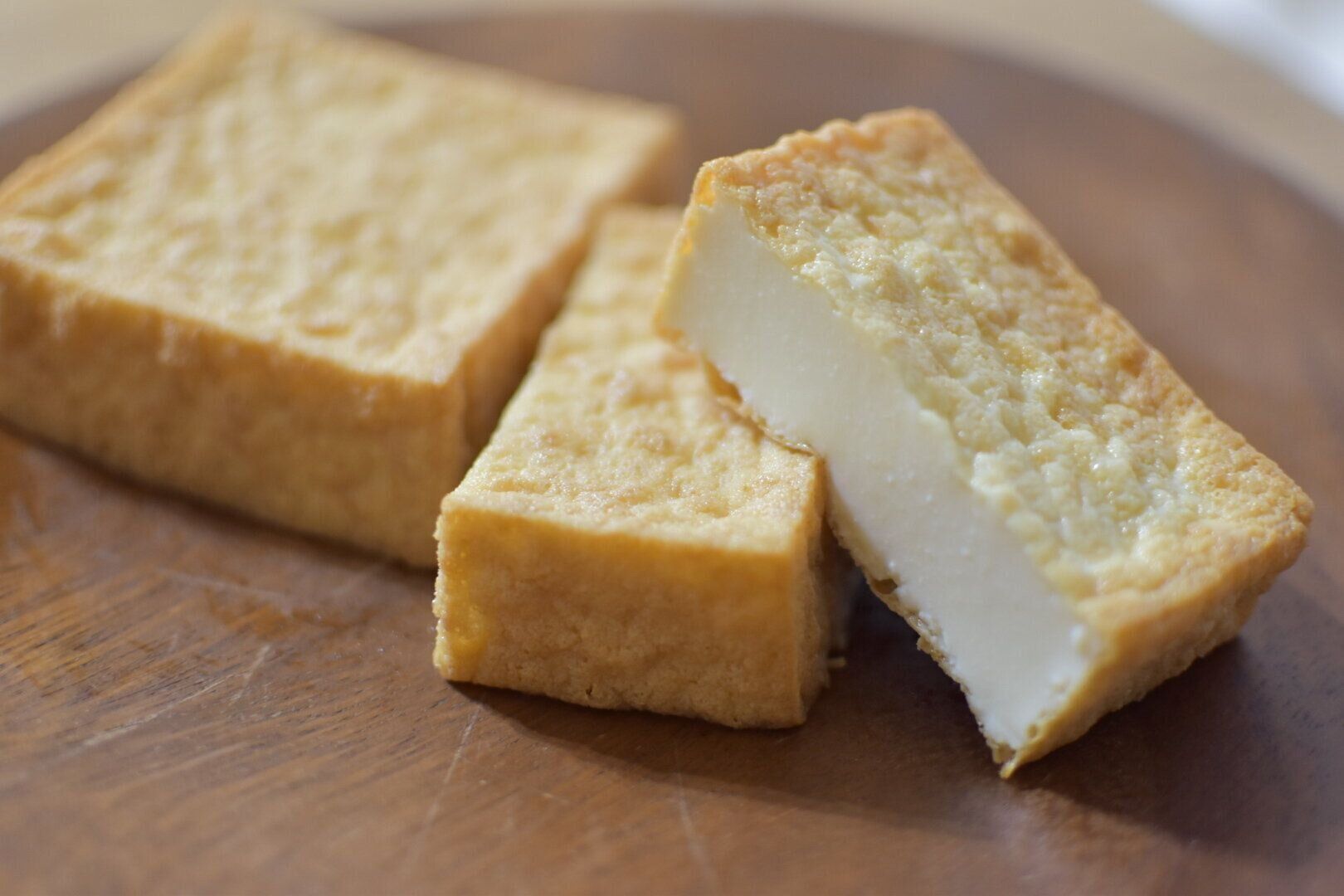 豆腐を厚めに切って揚げたもの。表面のみを揚げているので「生揚げ」ともいわれます。