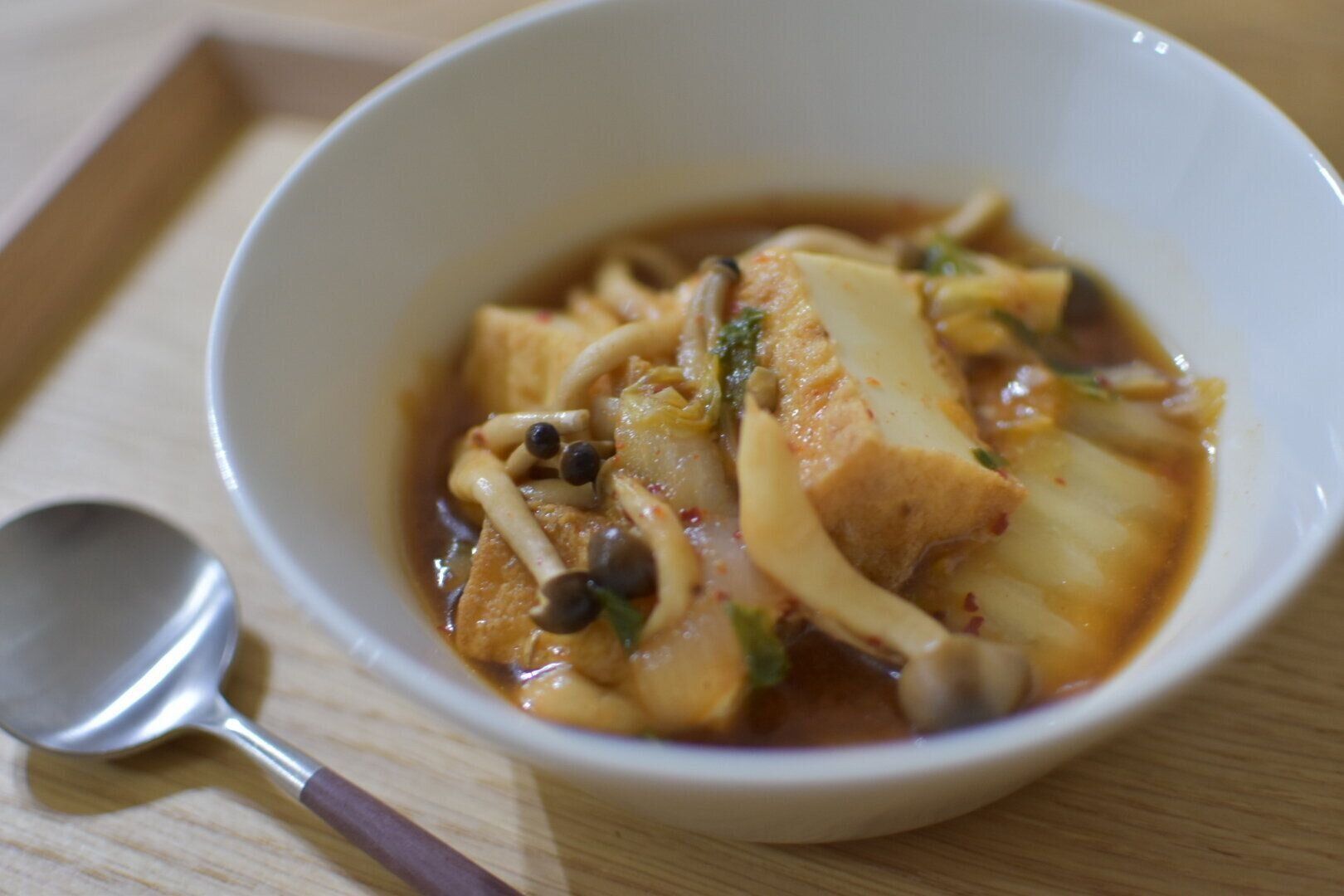 厚揚げ、キムチ、お好みの野菜(玉ねぎ、しめじ、白菜など)、鶏ガラスープ、味噌(赤味噌がおすすめ)