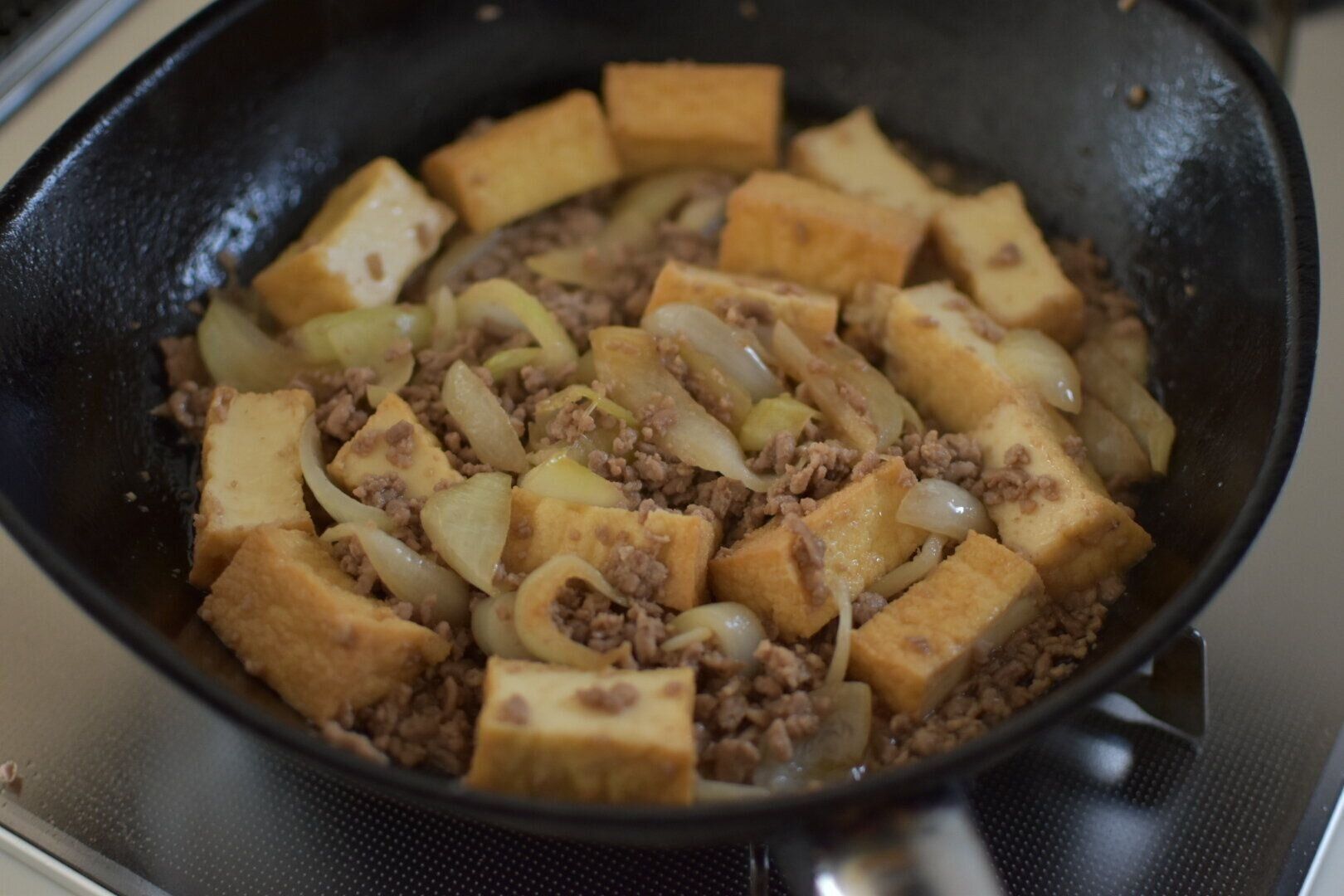 厚揚げ、牛か合いびき肉、お好みの食材、調味料(砂糖、酒、しょうゆ、みりん)水