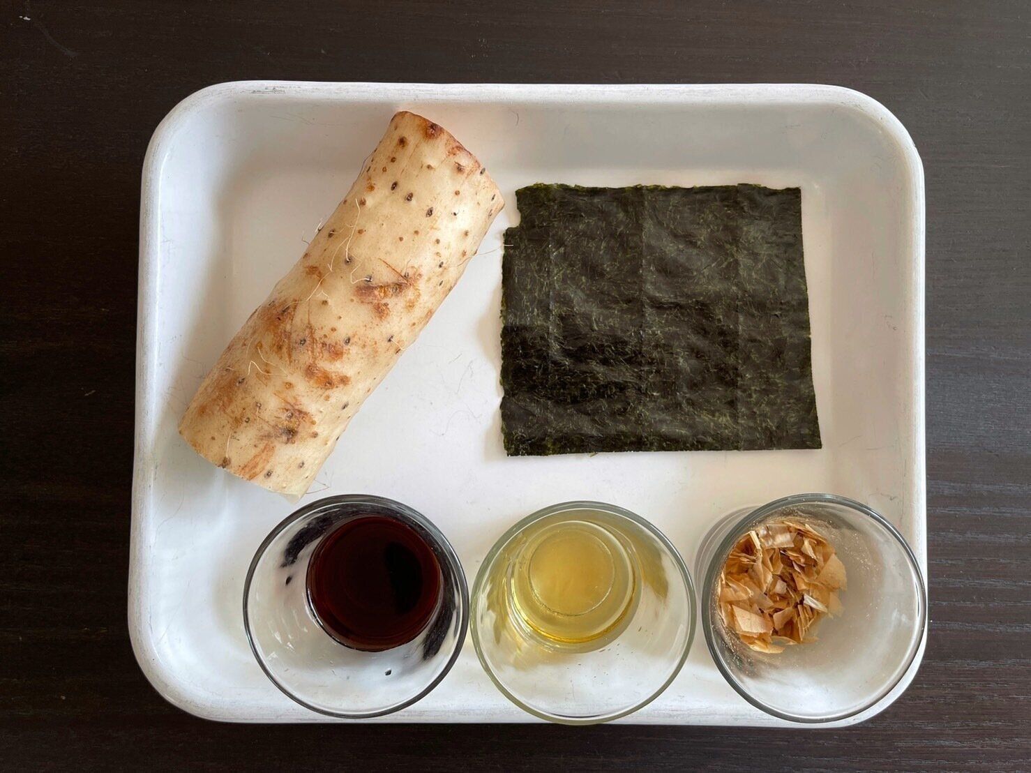 (3)皿に盛り付け、のり、かつおぶしをたっぷりかけて完成。