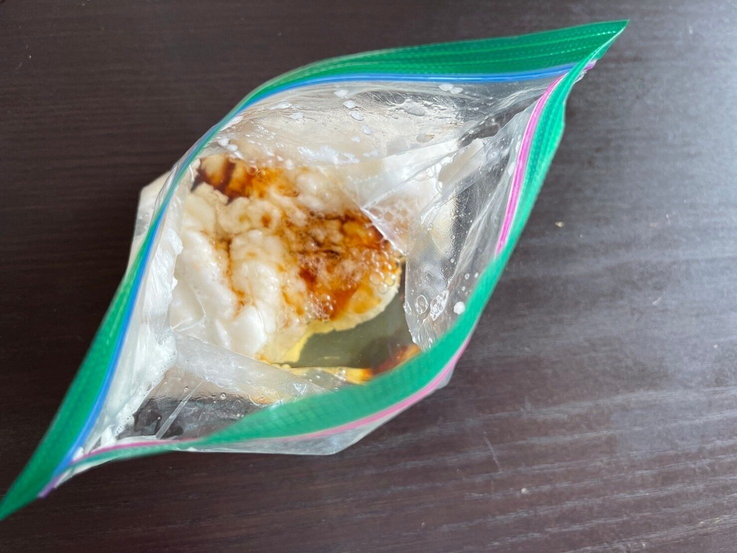 (3)(2)にめんつゆ、卵白を入れて袋の上から混ざるように揉みこむ。