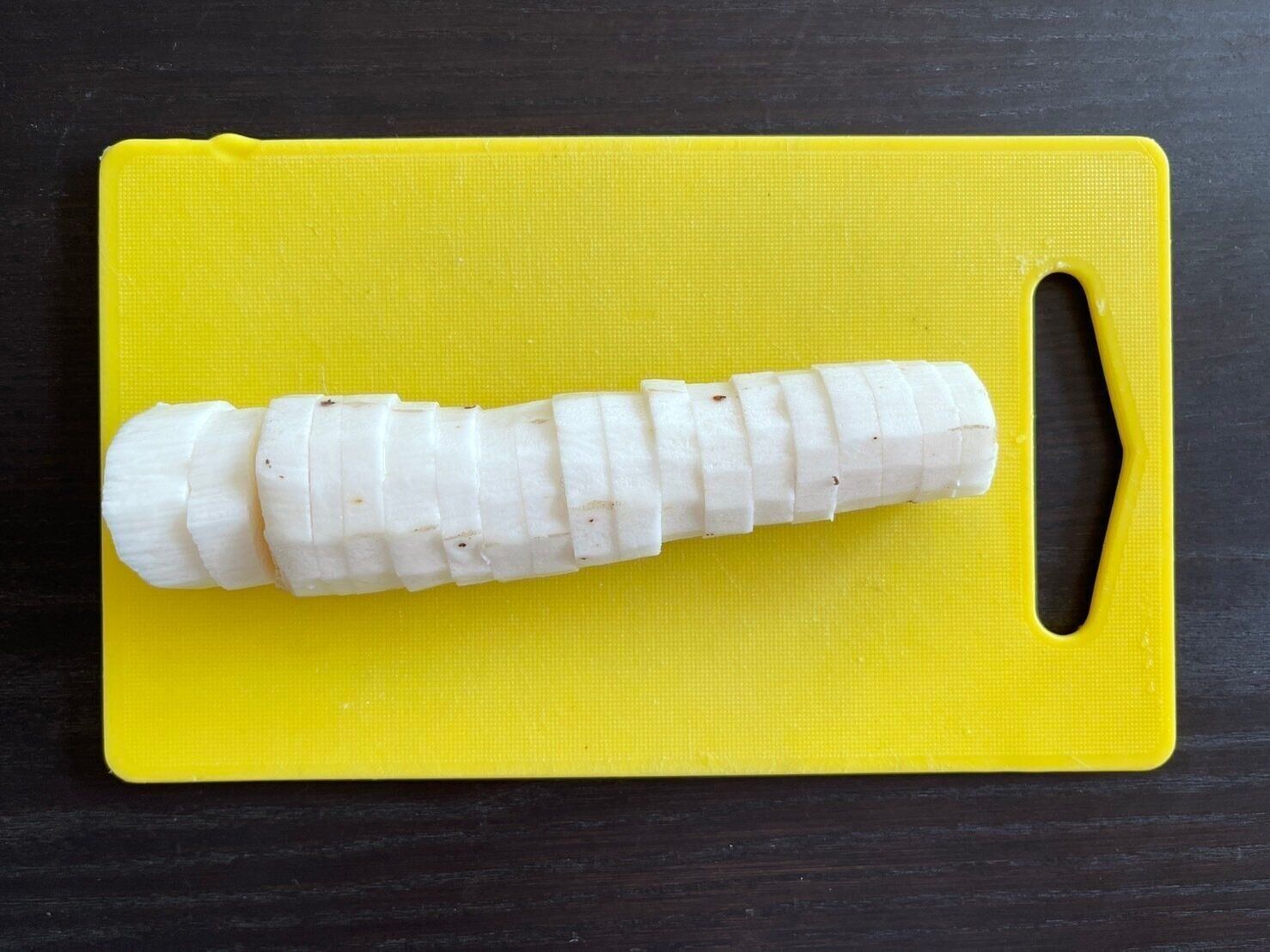 (1)長芋は皮を剥いて、1cm幅の輪切りにする。