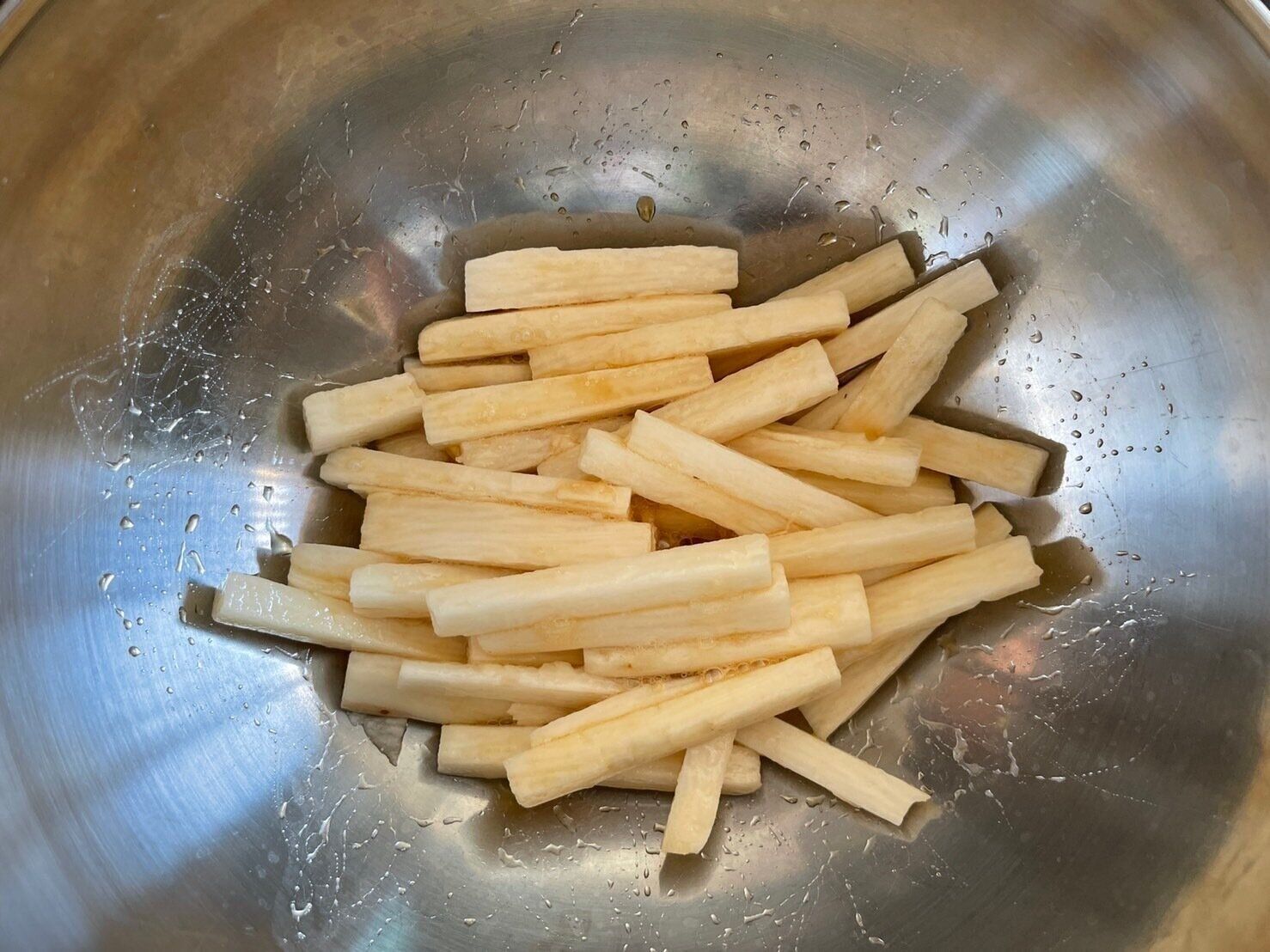 (1)長芋は皮を剥き、1cm幅の棒状に切る。