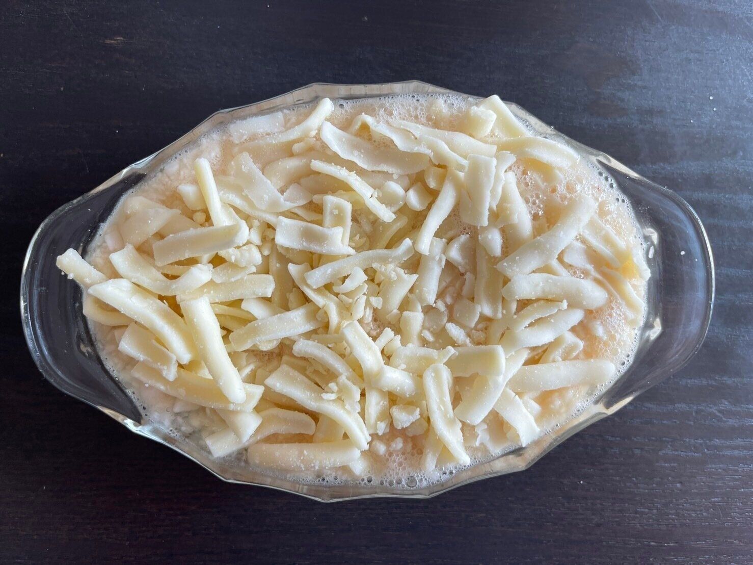 (4)耐熱容器に(3)を入れ、ピザ用チーズをのせる。
