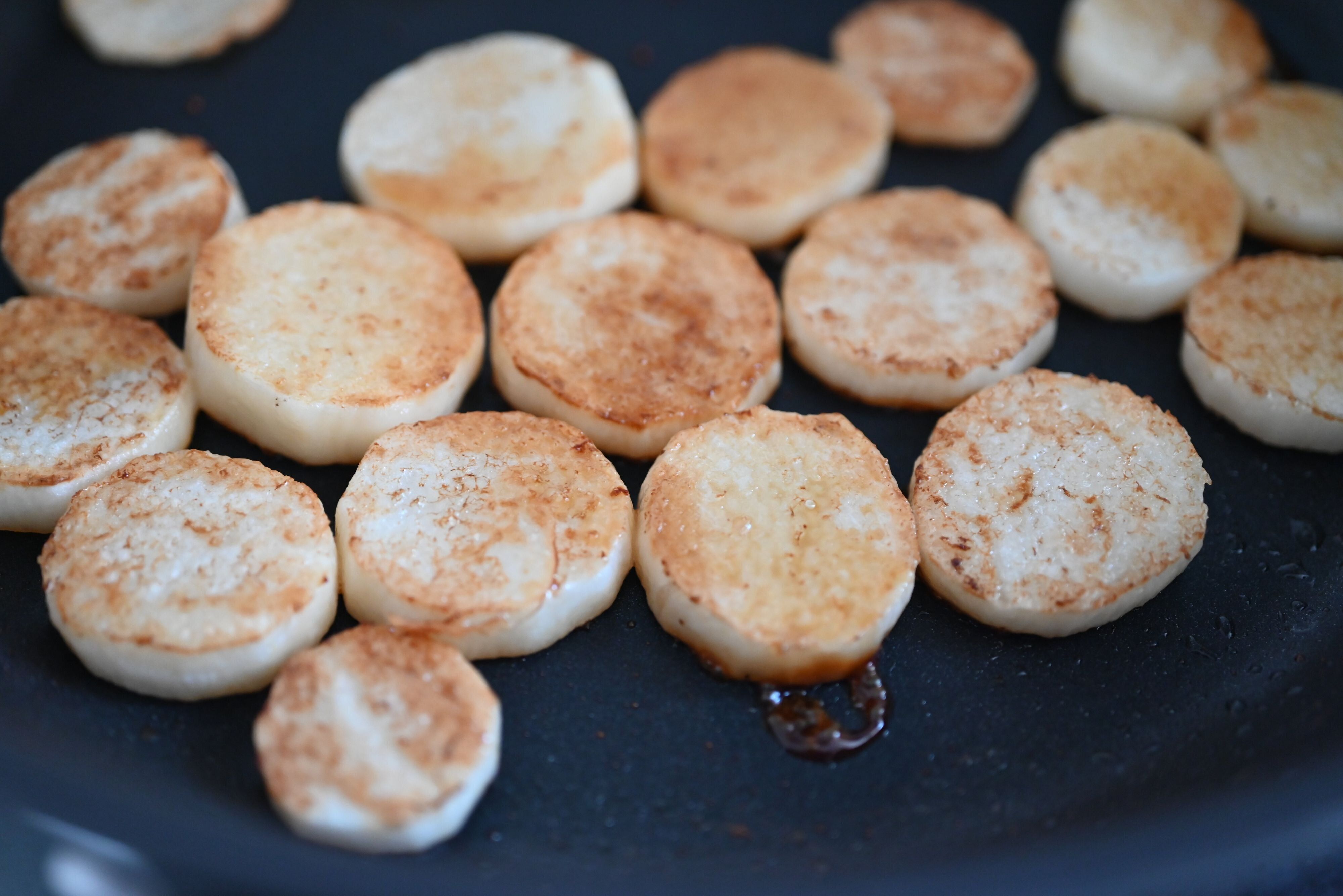 (2)フライパンにバターを加えて熱し、長芋に焼き色がつくまで両面焼く。