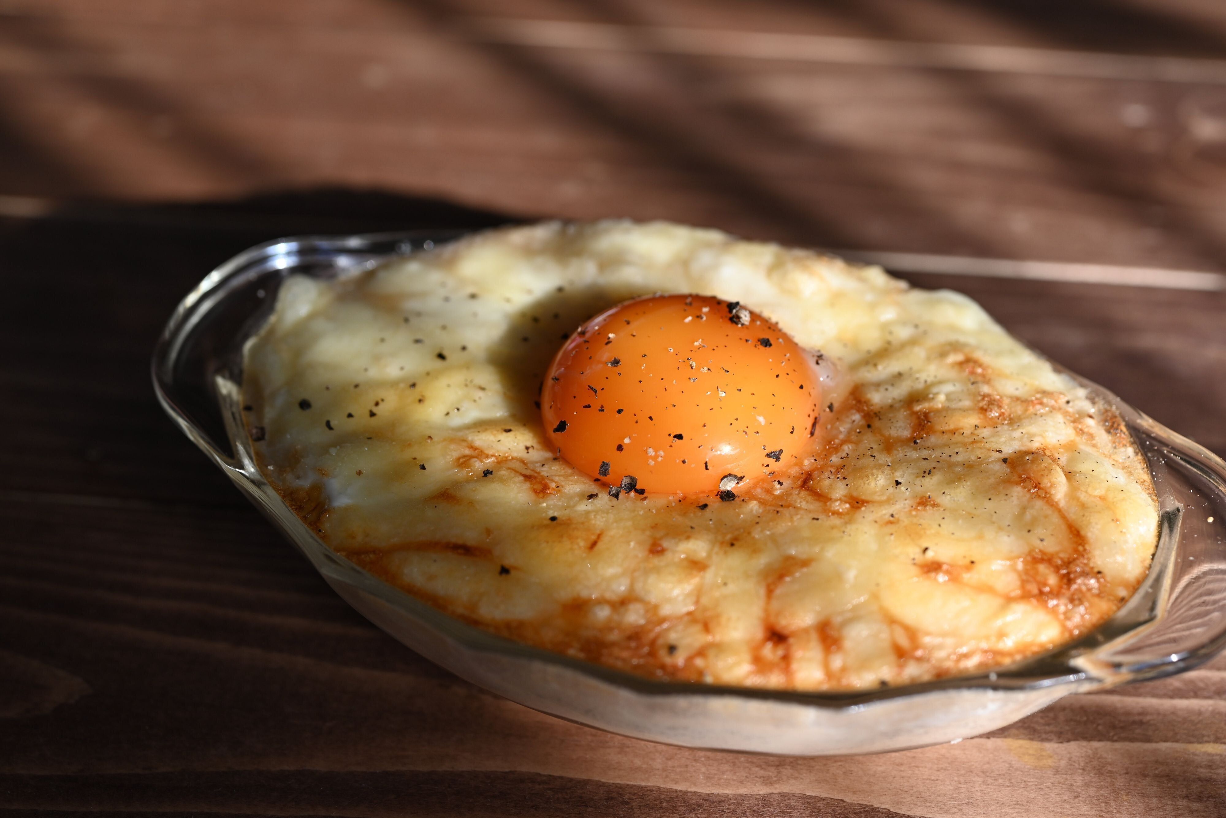 (5)魚焼きグリルやトースターでチーズに焼き色がつくまで加熱し、卵黄をのせて完成。