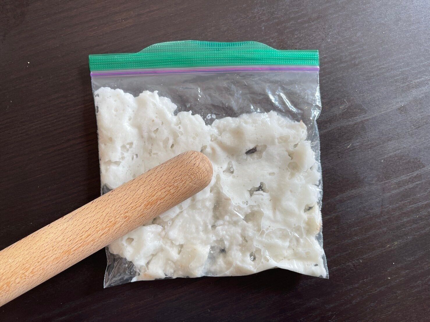 (2)ポリ袋に長芋を入れてめん棒で潰す。