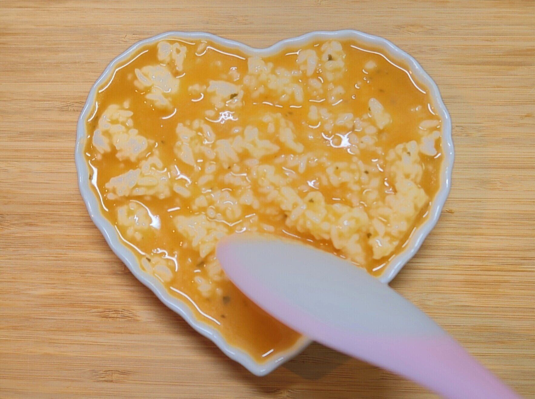 グラタン皿(または耐熱皿)にご飯を入れ、あたためたソースをかけてよく混ぜ合わせます。お好みで、オリーブオイルやブラックペッパーを加えるとさらにリッチな味わいに!