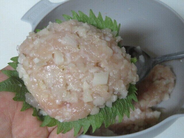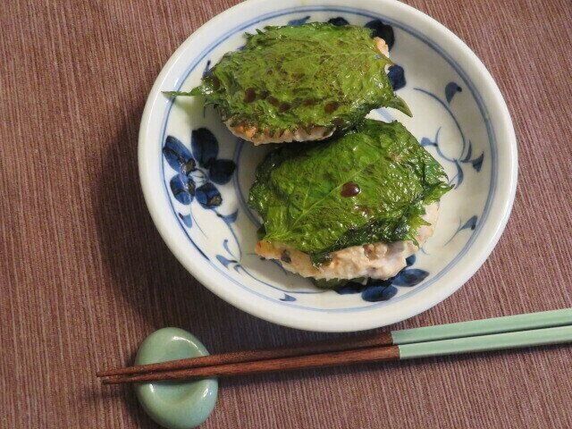 鶏ひき肉とレンコンを混ぜ、シソ(大葉)ではさんで揚げた料理です。
