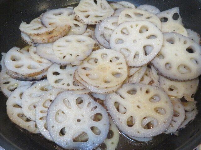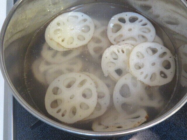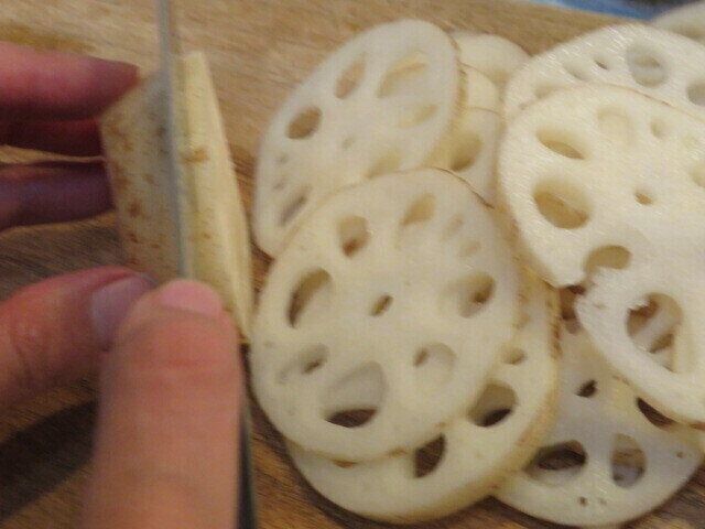 まずはレンコンを薄く輪切りにしていくのですが、これが意外と難しいのですよね。