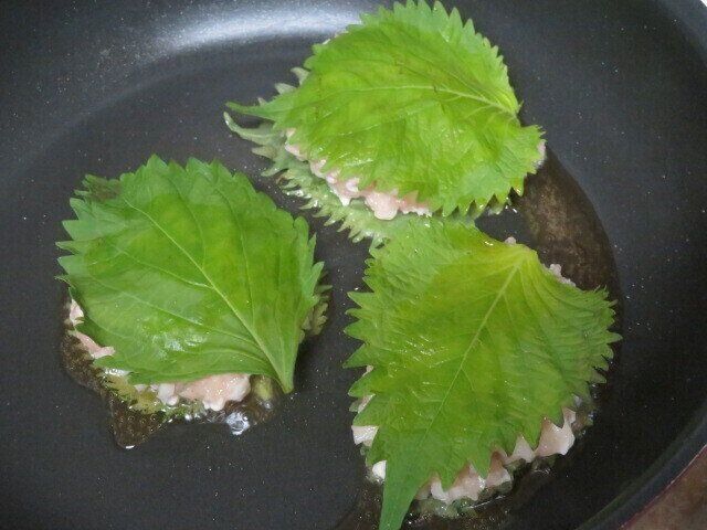 あとは、肉ダネを小判形にして表裏に1枚ずつシソをくっつけ、少ない油で揚げ焼きに。最後にしょう油をひとたらししただけで、おいしく食べられます。