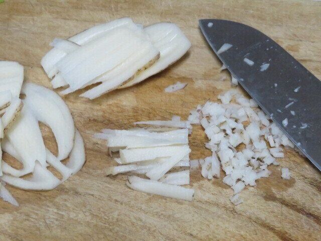 まずはレンコンを3ミリくらいの角切りにしてください。あまり細かくしすぎると食感が失われるので注意しましょう。