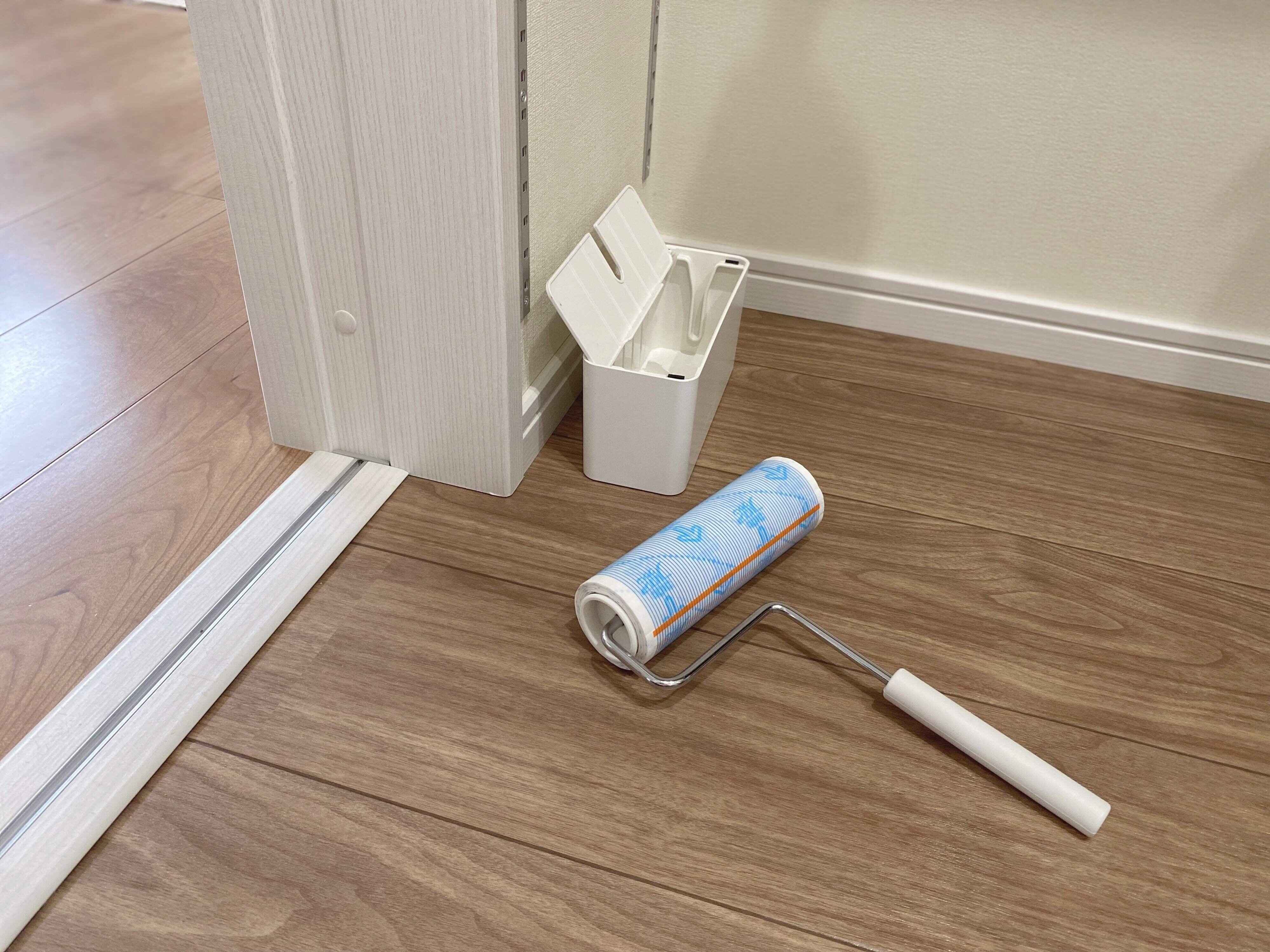 脱衣所の床は髪の毛やホコリ、糸くずが落ちていることがあります。気がついたときにすぐ取り出して使えるように、脱衣所の床にはコロコロ粘着シートを常に置いています。