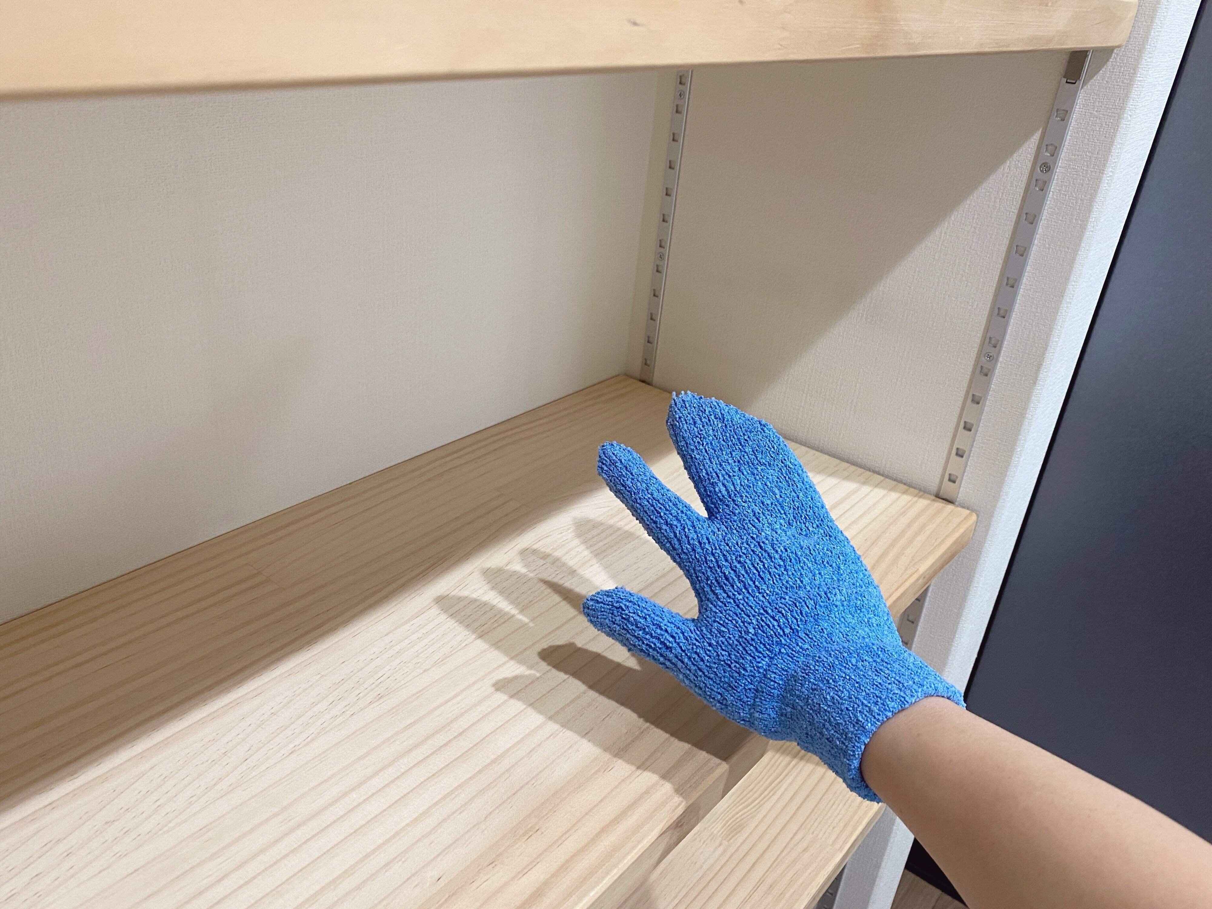 掃除の基本として手順は「上から下」へ行うので、棚などに置かれているのもは移動させ上から順番にホコリを取っていきましょう。おそうじ手袋は使い捨てではなく、洗って繰り返し使えます。
