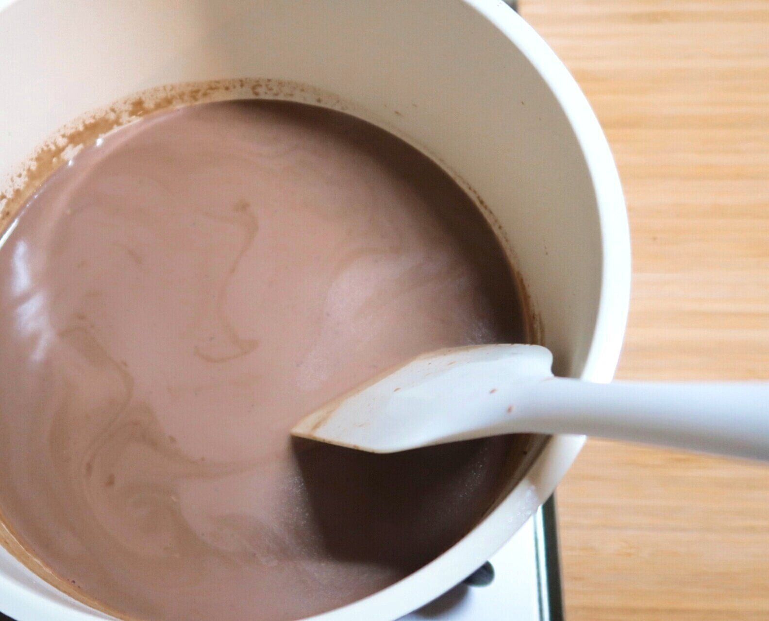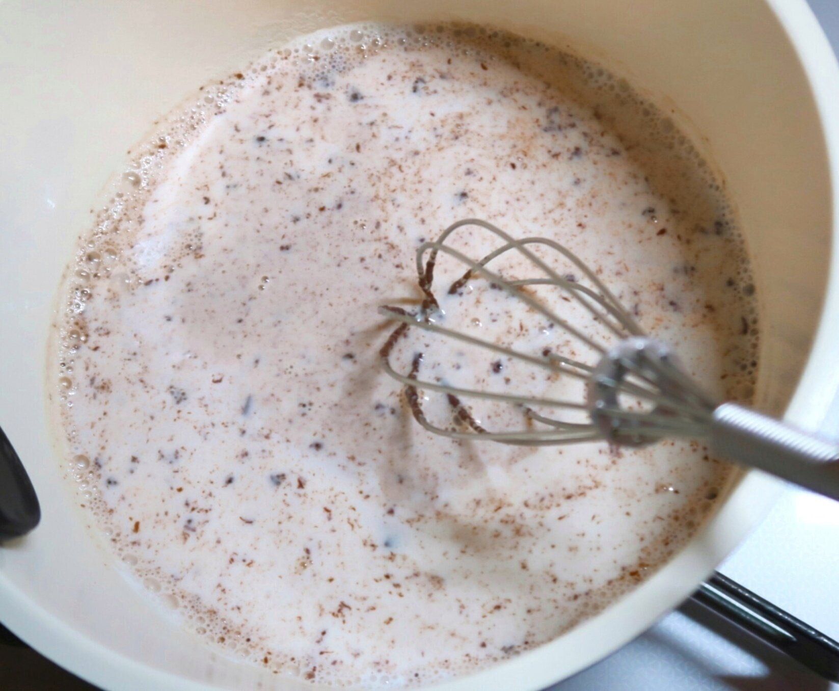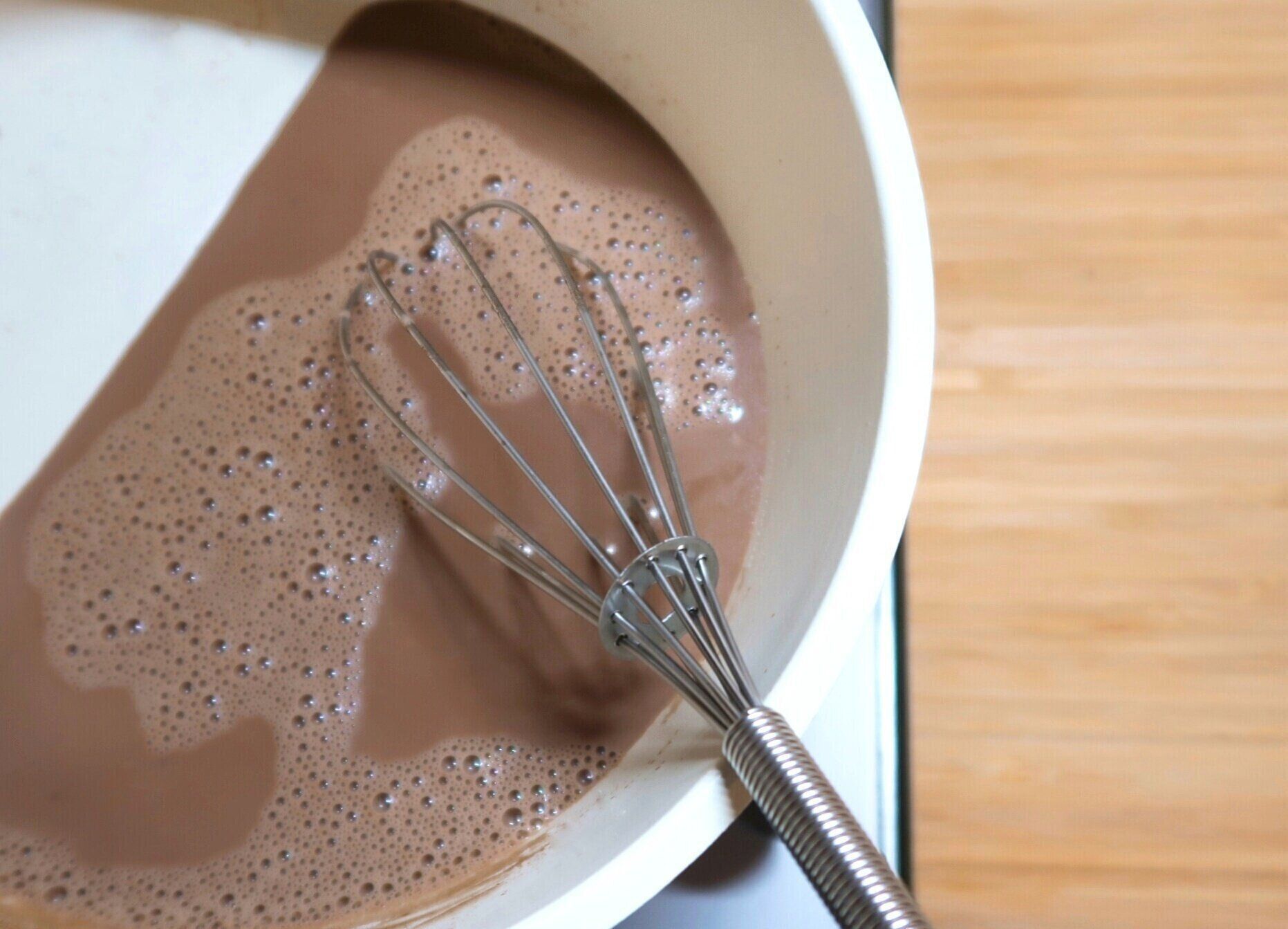 再び弱火にかけよく混ぜ合わせます。鍋をかたむけて泡立て器を左右にふるように混ぜると、チョコレートが溶けやすくなります。