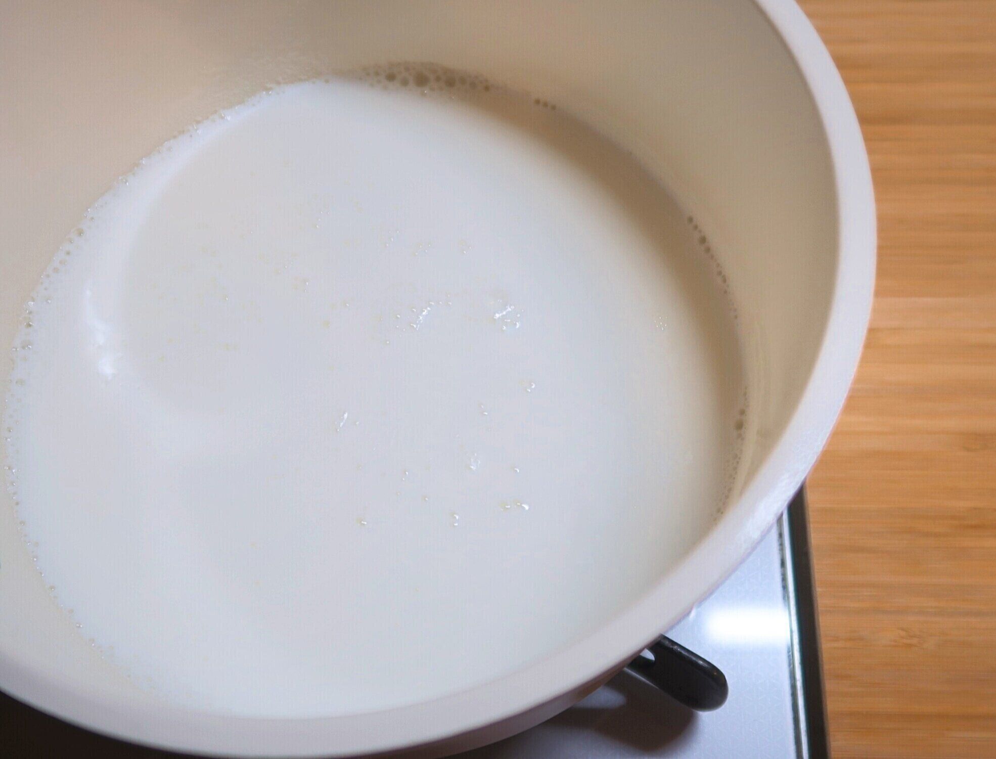 小さめの鍋に牛乳、水、砂糖を加え弱火にかけます。ヘラまたは泡立て器で混ぜながらじっくりあたためます。ここで牛乳を沸騰させないことがポイントです!