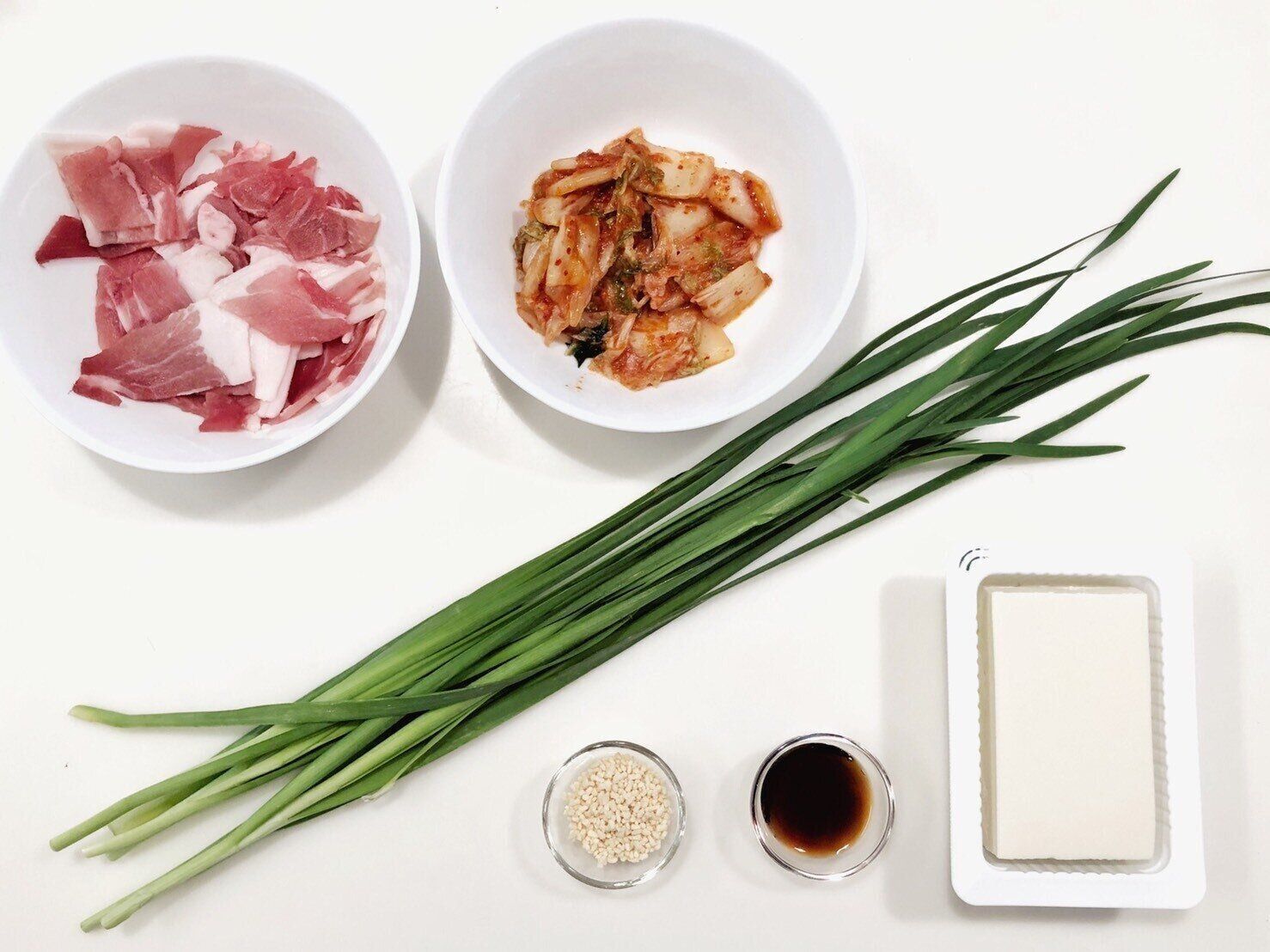 (2)食べやすい大きさに切った豆腐、キムチを入れ、鶏がらスープの素、めんつゆ、を入れる。