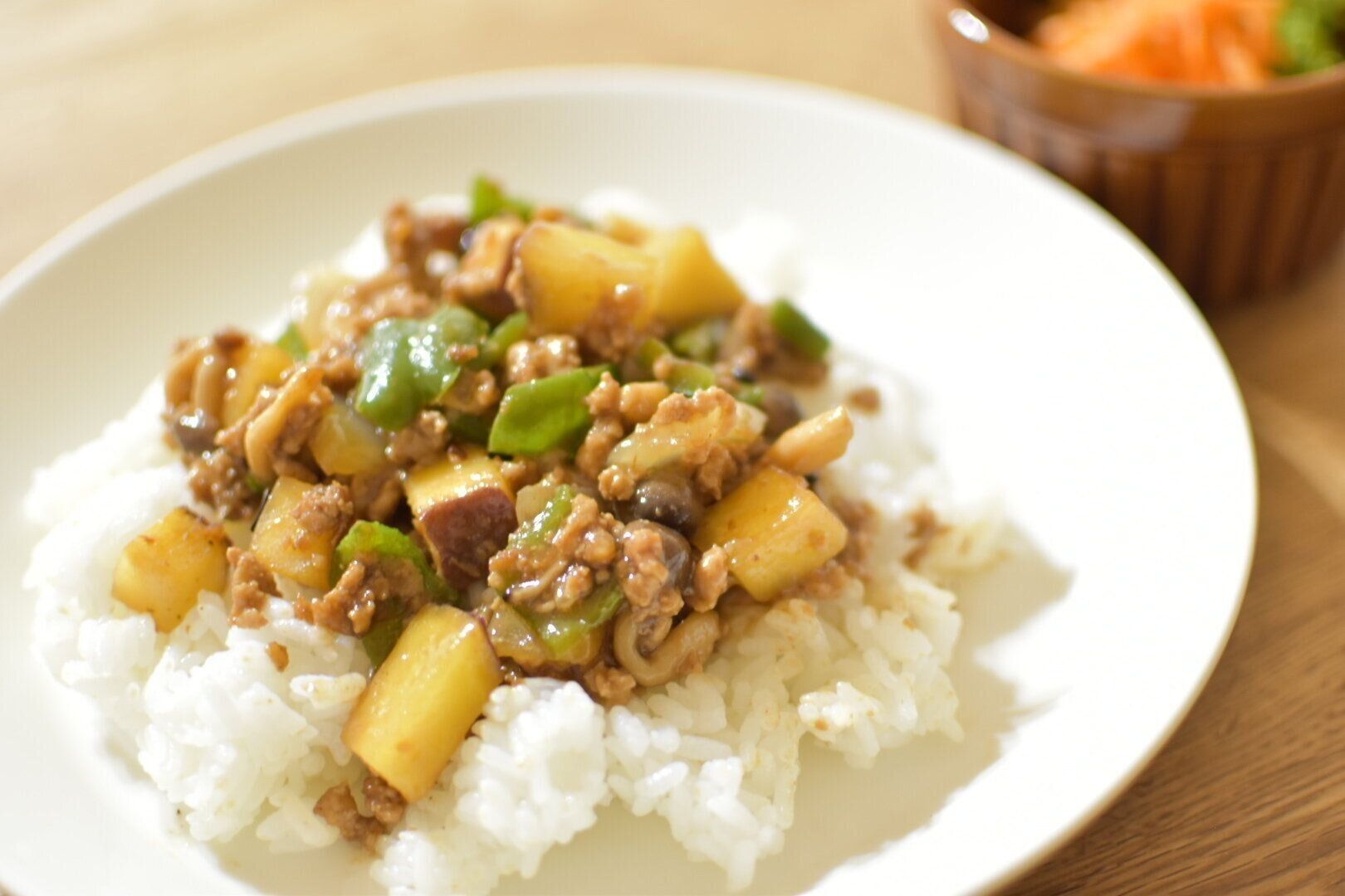 さつまいも、ピーマン、豚ひき肉、焼肉のたれ、水溶き片栗粉、ごま油
