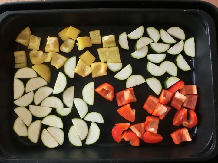 1.パプリカは2cm角にし、ズッキーニは5mm幅の半月切りにします。