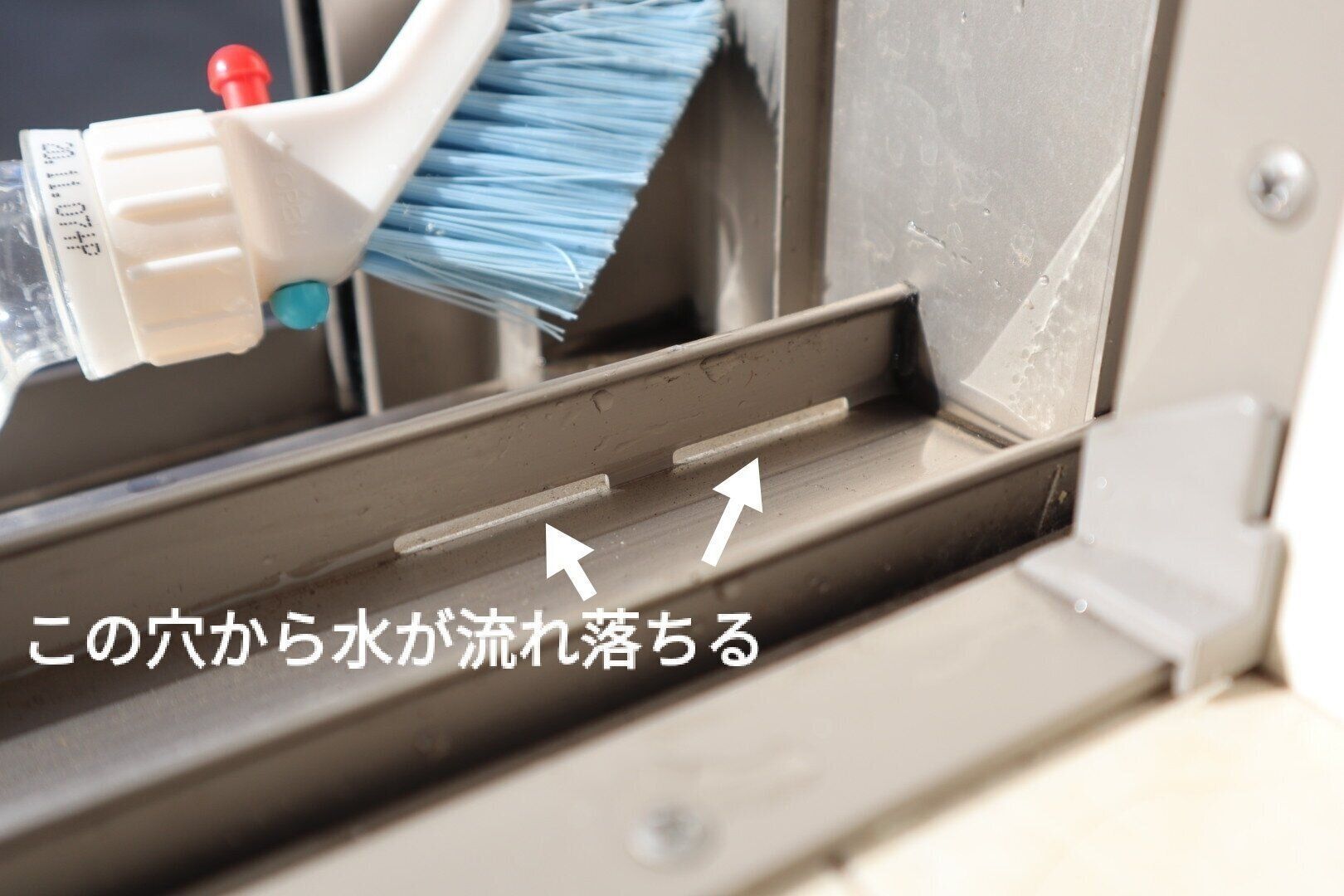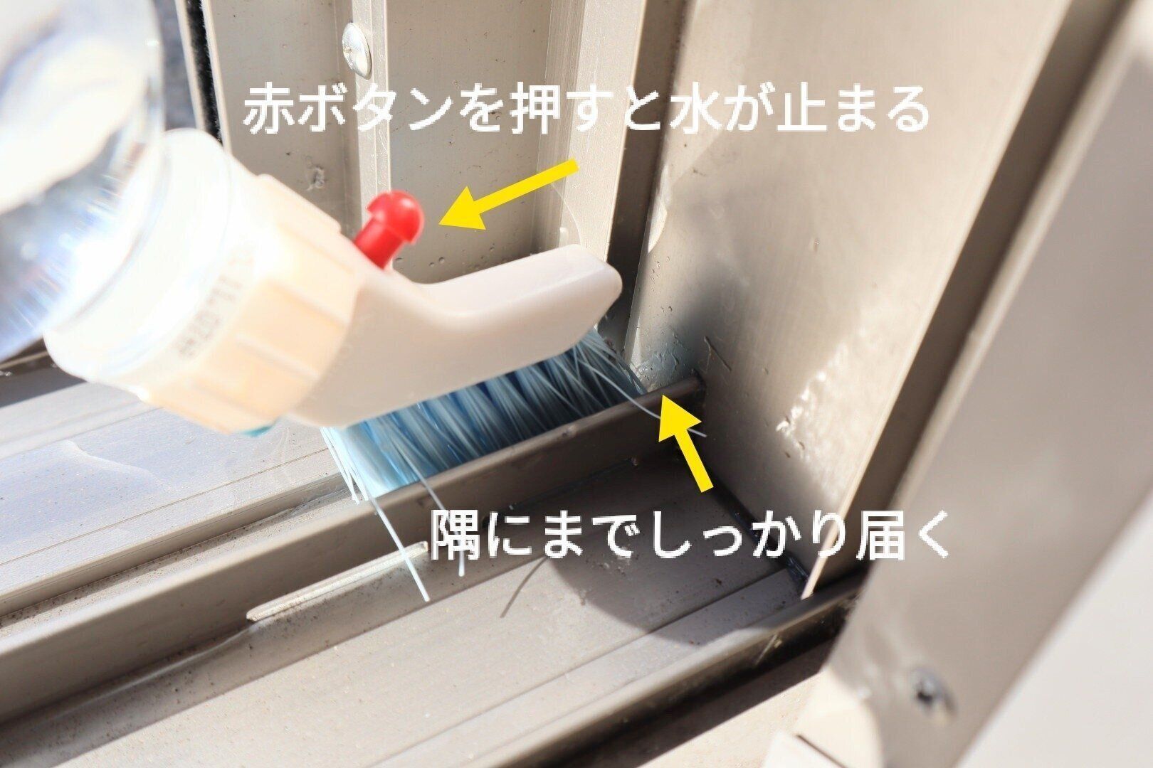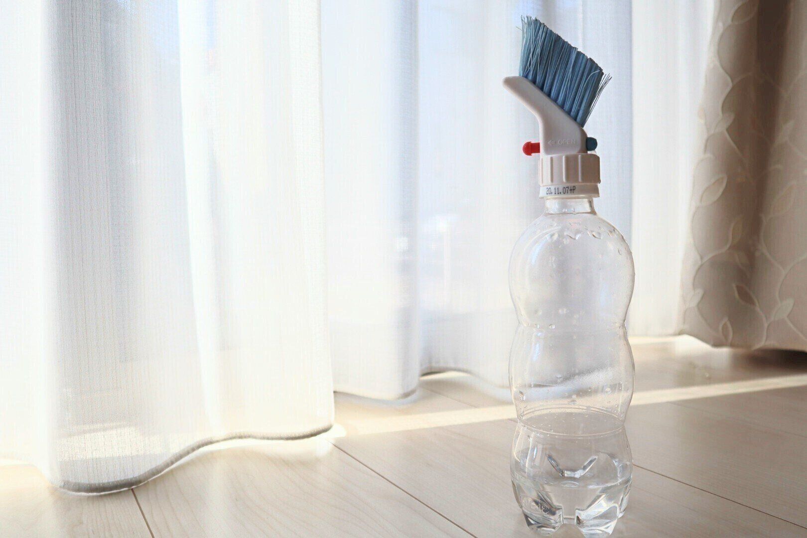 このブラシを水の入ったペットボトルに取りつけると、ブラシの先から少量の水が出てくる仕組みになっていて、掃除がしにくい窓のレールも、ブラシをなでるだけでスッキリきれいになります。