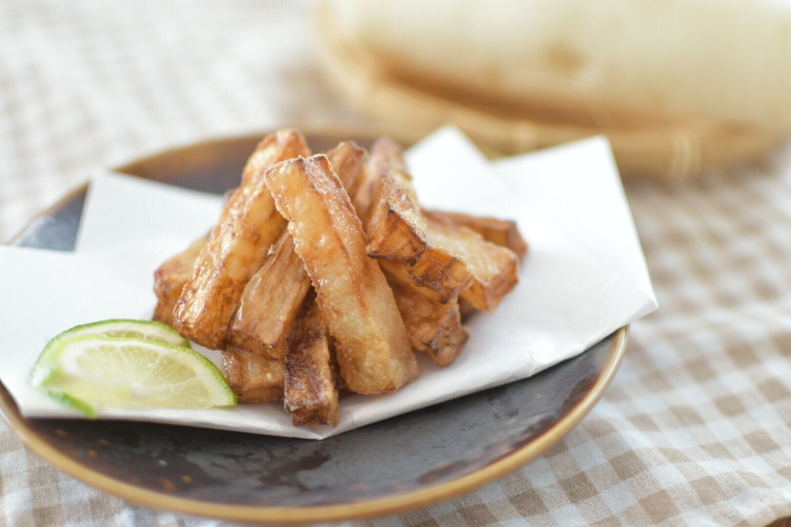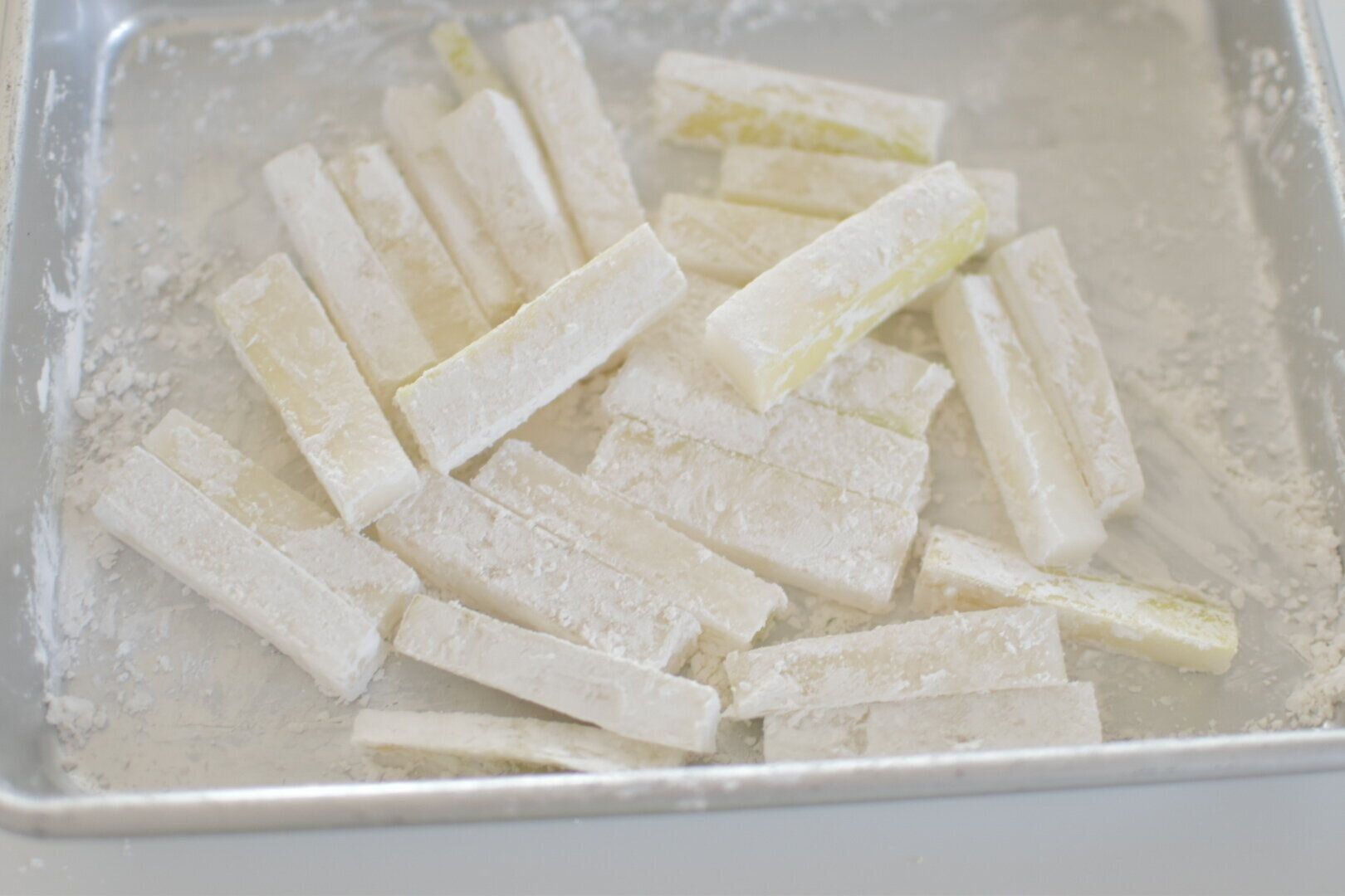 皮つきのまま短冊切りにしたら、全体に片栗粉をまぶして油できつね色になるまで揚げるだけ。